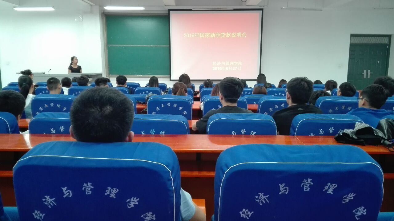 为贯彻落实学生处下发的《关于组织申请2016年国家助学贷款的通知》, 6月27日中午12:20,经济与管理学院在经管楼211召开国家助学贷款申请流程说明及诚信教育大会,负责贷款工作的王静老师和2016年申请校园地助学贷款的学生参加了本次会议。