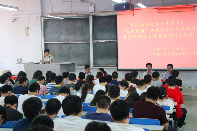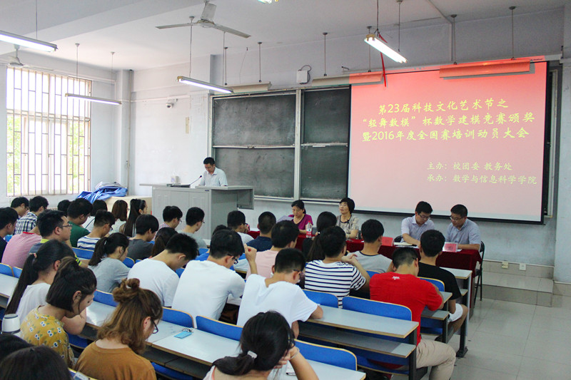 7月1日15时,数学与信息科学学院于东风校区东一楼218教室召开了郑州轻工业学院第二十三届科技文化艺术节之“轻舞数模”杯数学建模竞赛颁奖暨2016年全国赛培训动员大会。校团委书记葛勋、教务处副处长阮世敏、数学与信息科学学院院长郭晓丽、副院长黄士国、数学建模指导教师及我校数学建模竞赛获奖同学参加了会议。会议由学院党总支副书记张阳主持。