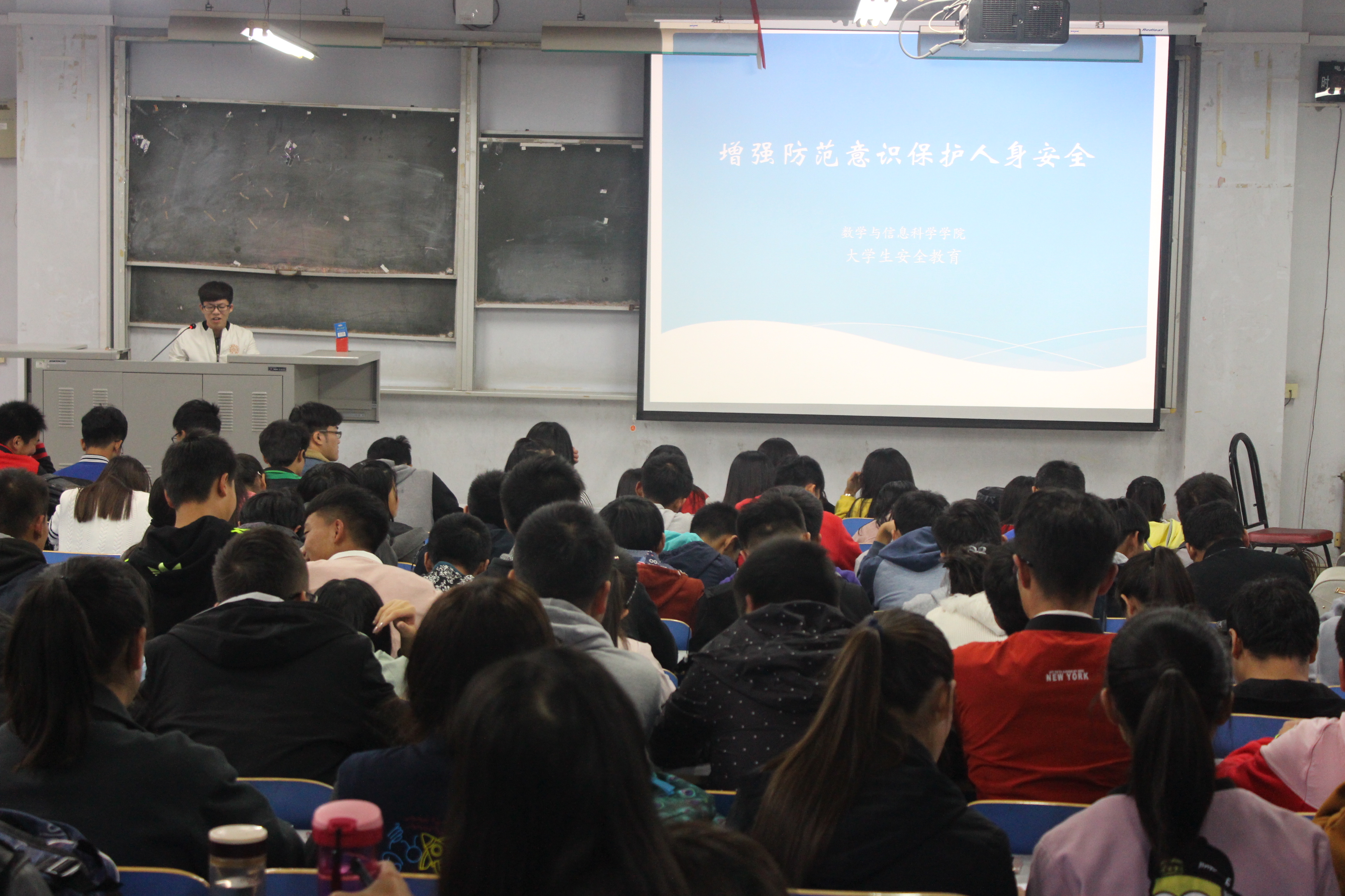 为提高新生的安全意识,加强校园安全教育,创建和谐校园环境,10月26日下午,数学与信息科学学院在东一楼218举办了新生安全教育大会。