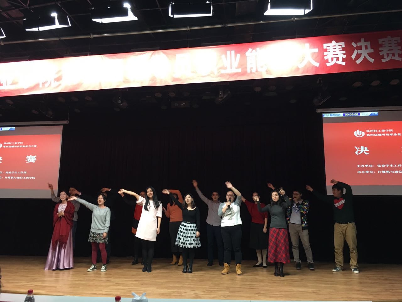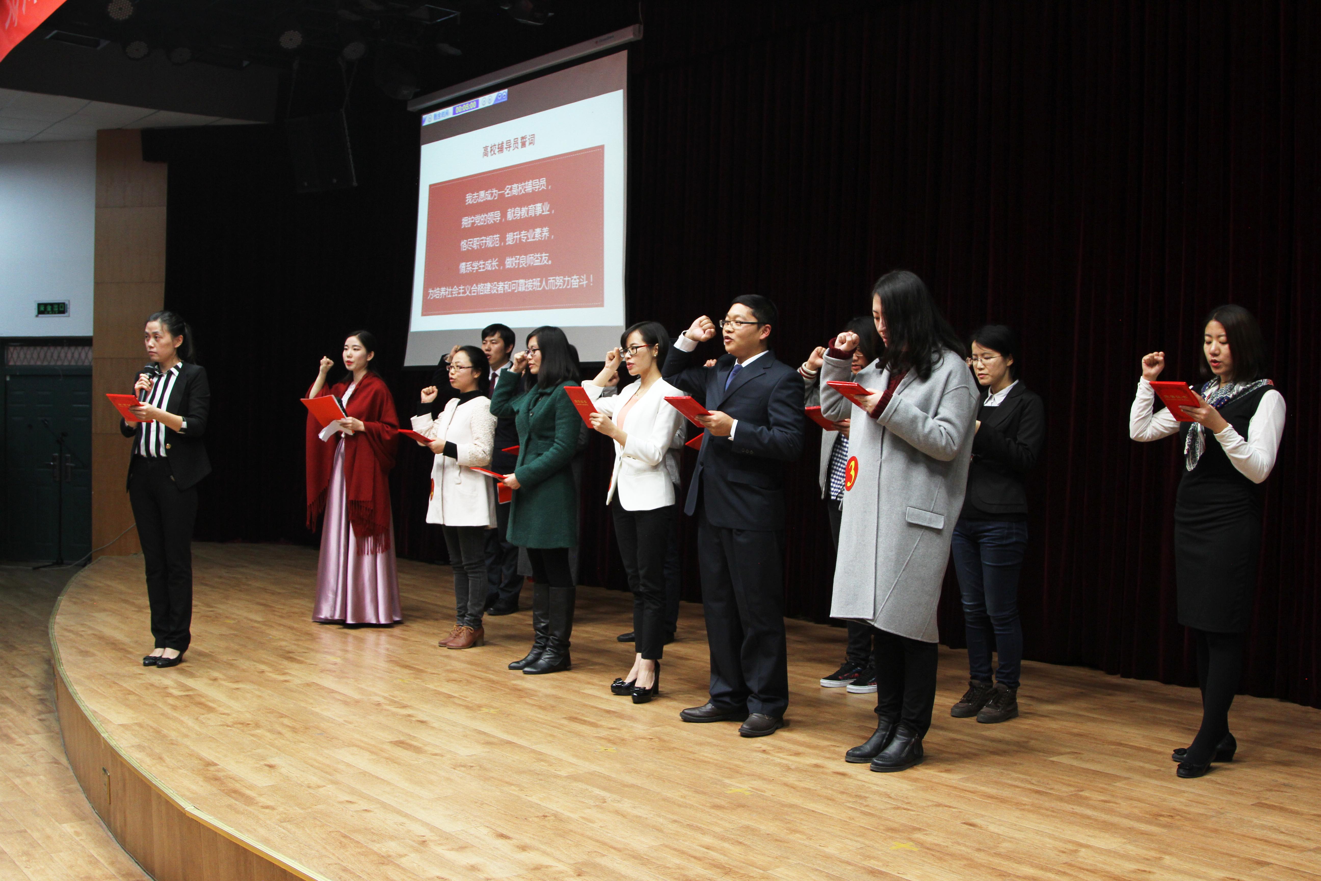 决赛由特色工作展示与答辩、案例分析、谈心谈话三个环节两个阶段构成,由来自8个学院的9名辅导员老师展开角逐。最终国际教育学院张瑞凤、经济与管理学院王静获一等奖;电气信息工程学院许海龙、机电工程学院孔馨雨、计算机与通信工程学院欧阳杜鹃获二等奖;国际教育学院韩笑、食品与生物工程学院马瑞静、体育学院李羚玮、软件学院寇誉元获三等奖。张瑞凤和李燕获最佳班会奖,杜明明和赵梦婕获最佳新人奖。赛后,2016年新进辅导员表演了精彩的小合唱《相亲相爱的一家人》。大赛一等奖获奖者张瑞凤领誓,全场专兼职辅导员重温了《辅导员誓词》。