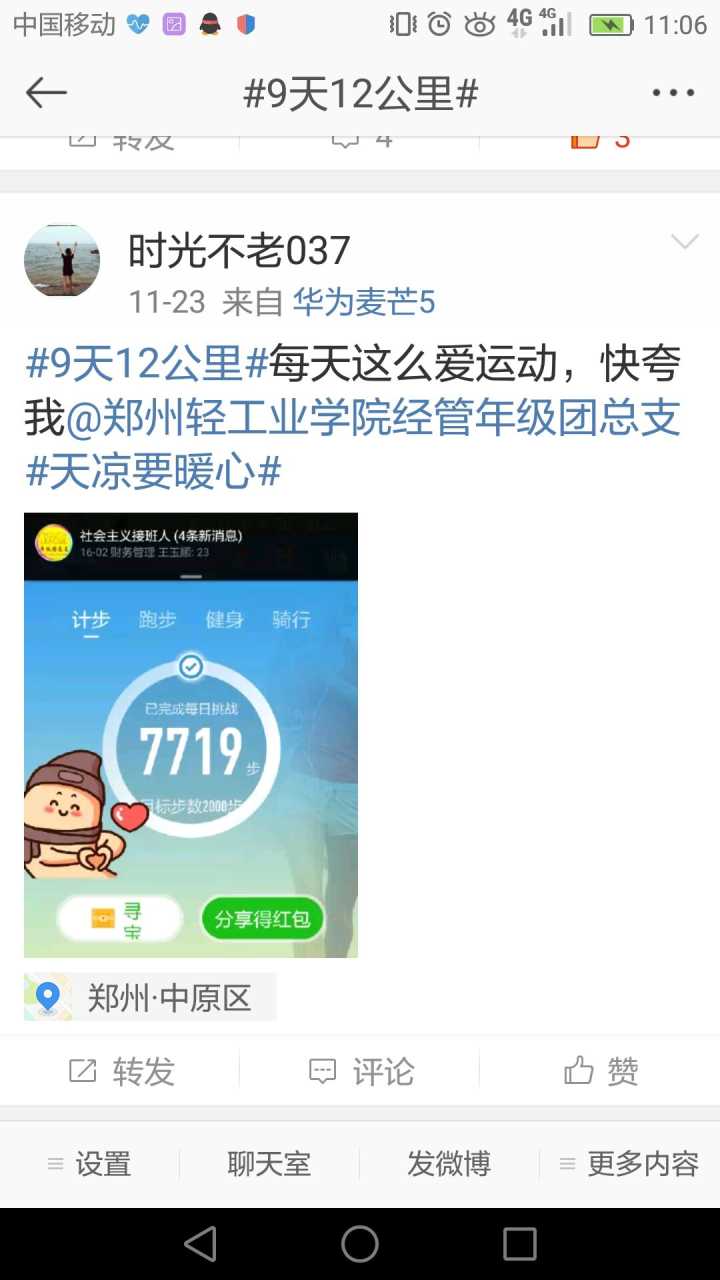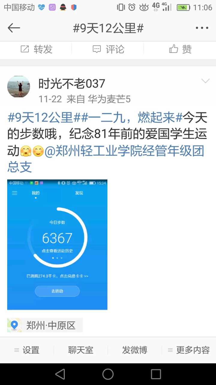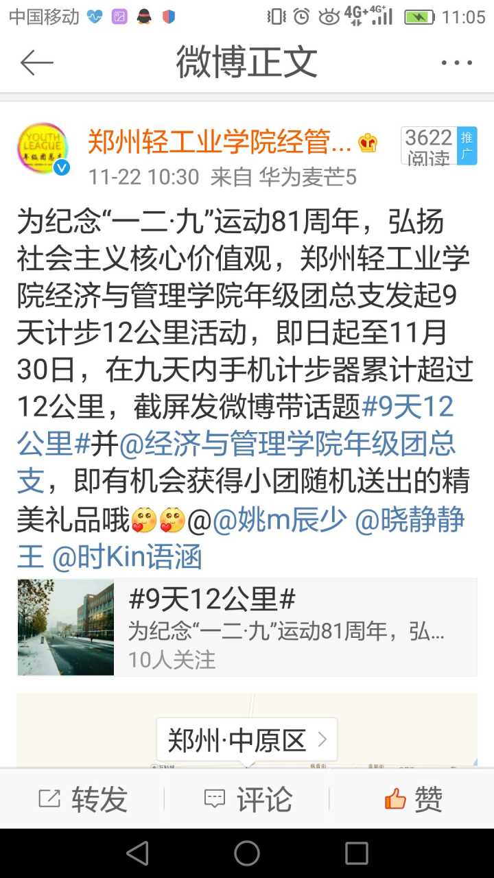 如今随着网络的快速发展和双微平台的建立与不断完善,微博微信成为了活动的可依托平台,经济与管理学院为响应中央共青团的号召,同时也为创新活动形式,能够让同学们在纪念爱国运动的同时增强体质,展示出当代青年学子的风采,决定以大家熟知的微博话题形式进行“9天12公里”计步活动。话题内容为在9天内手机计步器累计满12公里,截屏发微博带话题#9天12公里#并@郑州轻工业学院经管年级团总支,即可参与活动。活动开始后,同学们纷纷晒出了自己的运动成果,使得同学们在锻炼身体、增强体质的同时对一二九爱国运动有了更深层次的理解。