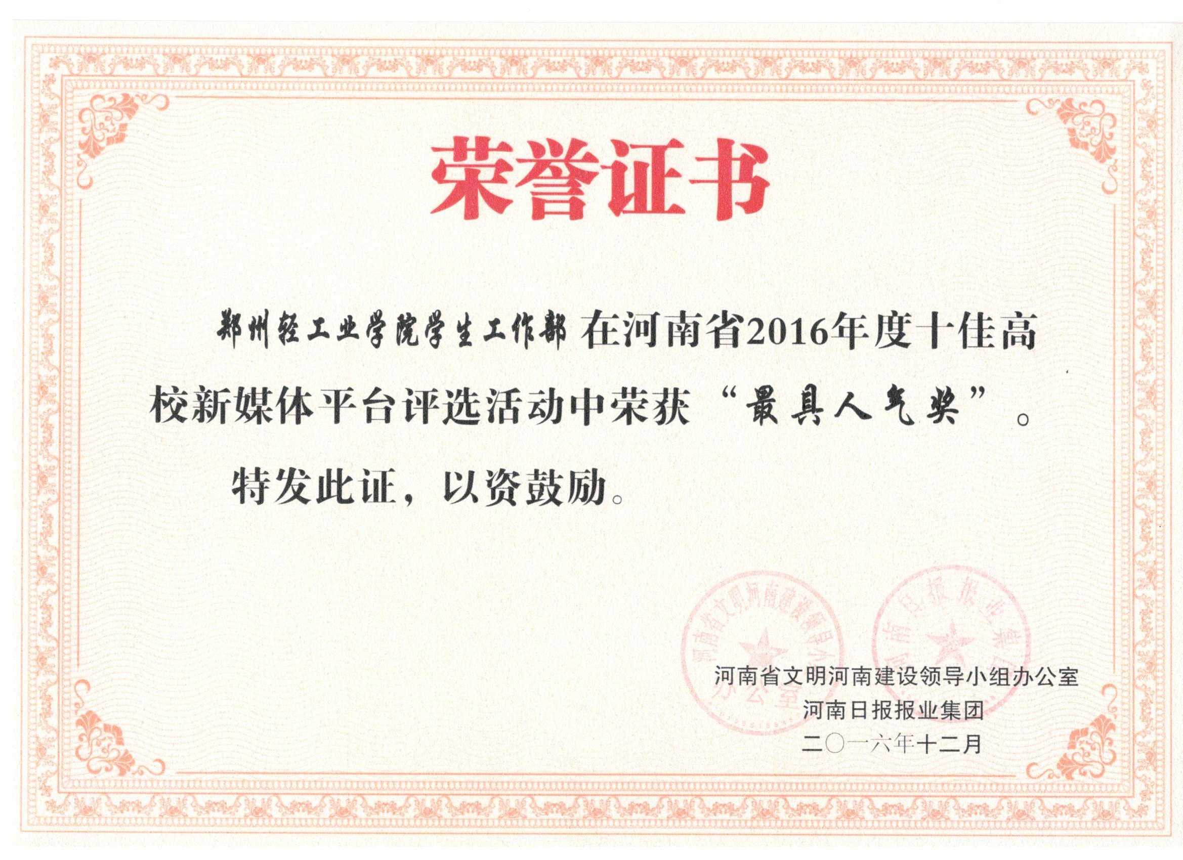 近日,由省委宣传部、河南日报报业集团主办,大河报▪大河客户端、中原新媒体联盟承办的河南首届大学生新媒体原创作品大赛暨2016年度十佳高校新媒体平台评选活动圆满结束。全省35所高校、108个新媒体平台,超过500个作品参加了本次活动,221万在校大学生网友参与。我校学工部官方微信平台获评2016年度十佳高校新媒体平台评选活动“最具人气奖。”