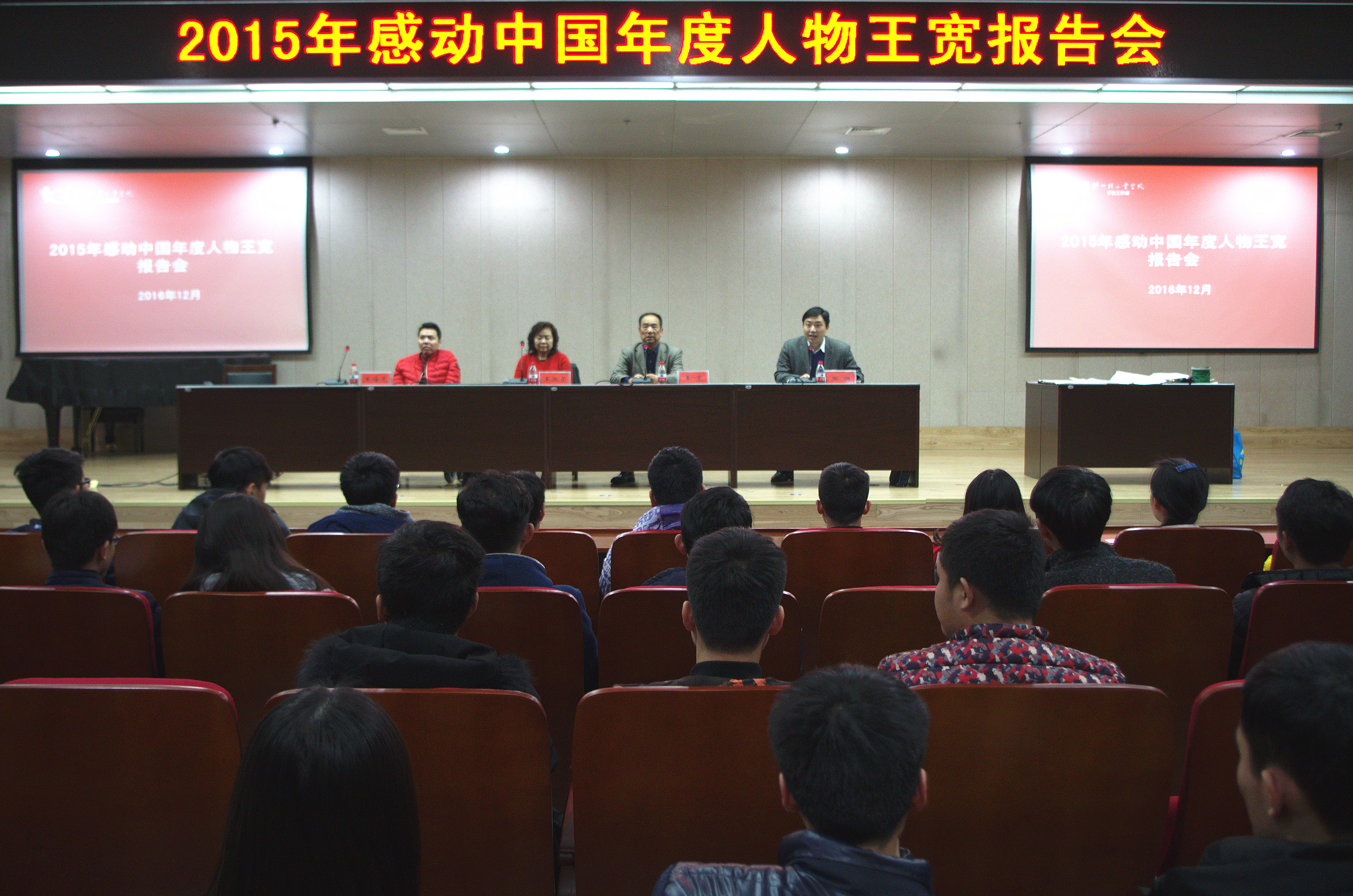 12月30日下午,由党委学工部主办的2015年感动中国年度人物---王宽报告会在科学校区图书馆报告厅举行,科学校区各学院辅导员、学生代表500余人到场聆听。