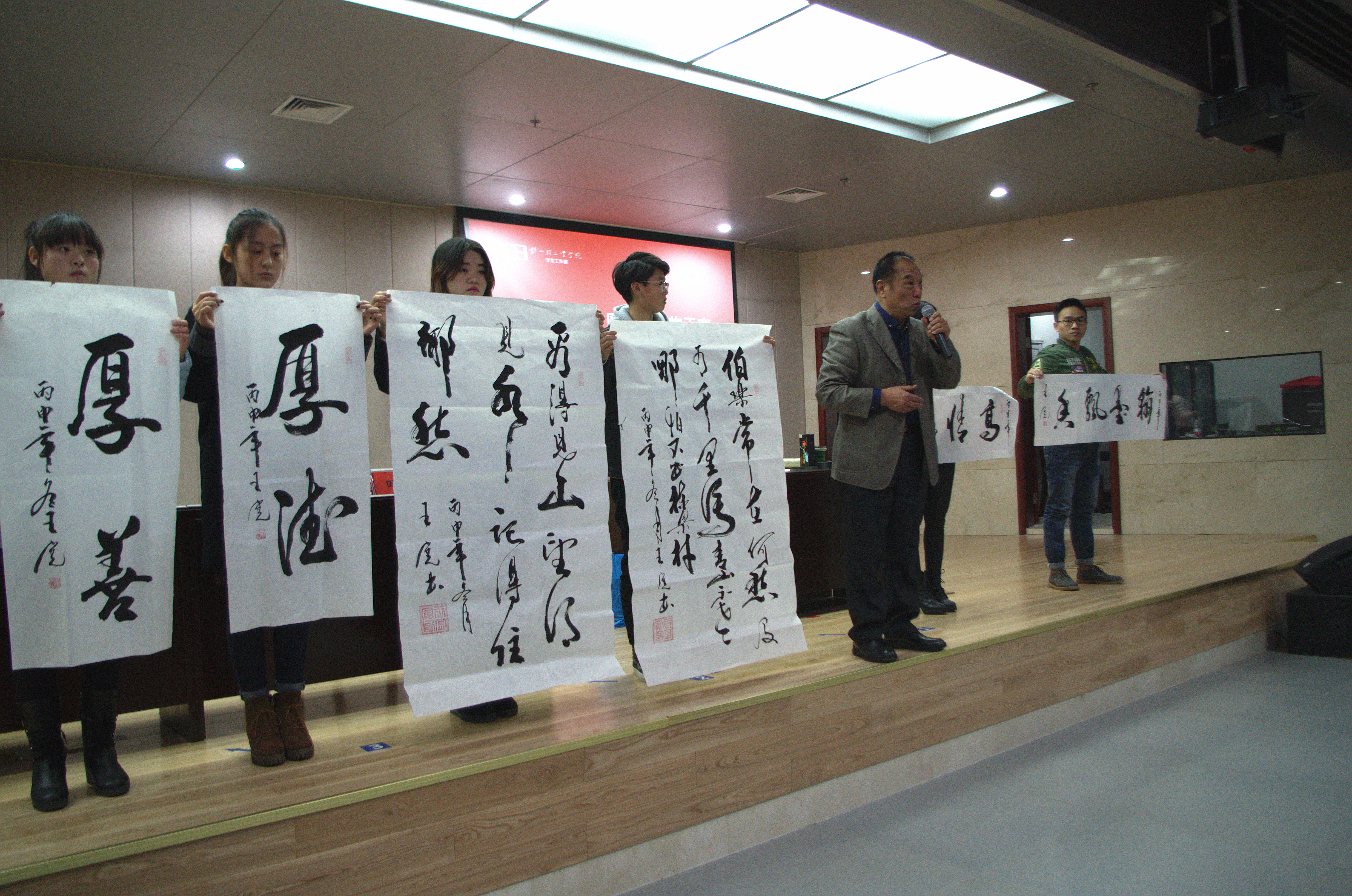 王宽及其家人以真挚的情感、朴实的语言与我校大学生分享了他们感人的心路历程。近20年来,豫剧“名角”王宽穿梭于大大小小的茶楼“卖唱”,将收养的6个孤儿养大成人,并向社会慈善事业捐款逾百万元。他们用实际行动谱写了大爱无言、大德无疆的事迹,感染了在场师生,赢得了热烈掌声。报告会最后,王宽老师留下了“厚善”、“厚德”等六幅墨宝,其外孙王海龙的一曲《让梦飞翔》更是将活动推向高潮。王宽及其家人以高尚的品德,朴实的付出,践行了习近平总书记弘扬真善美,传播正能量的指示精神,温暖了人心,感动了中国,为全社会树立了榜样,在第一届全国文明家庭表彰该大会上受到习近平总书记接见。我校师生也表达了对王宽及其家人默默无闻做奉献、持之以恒献爱心的深深崇敬与祝福。