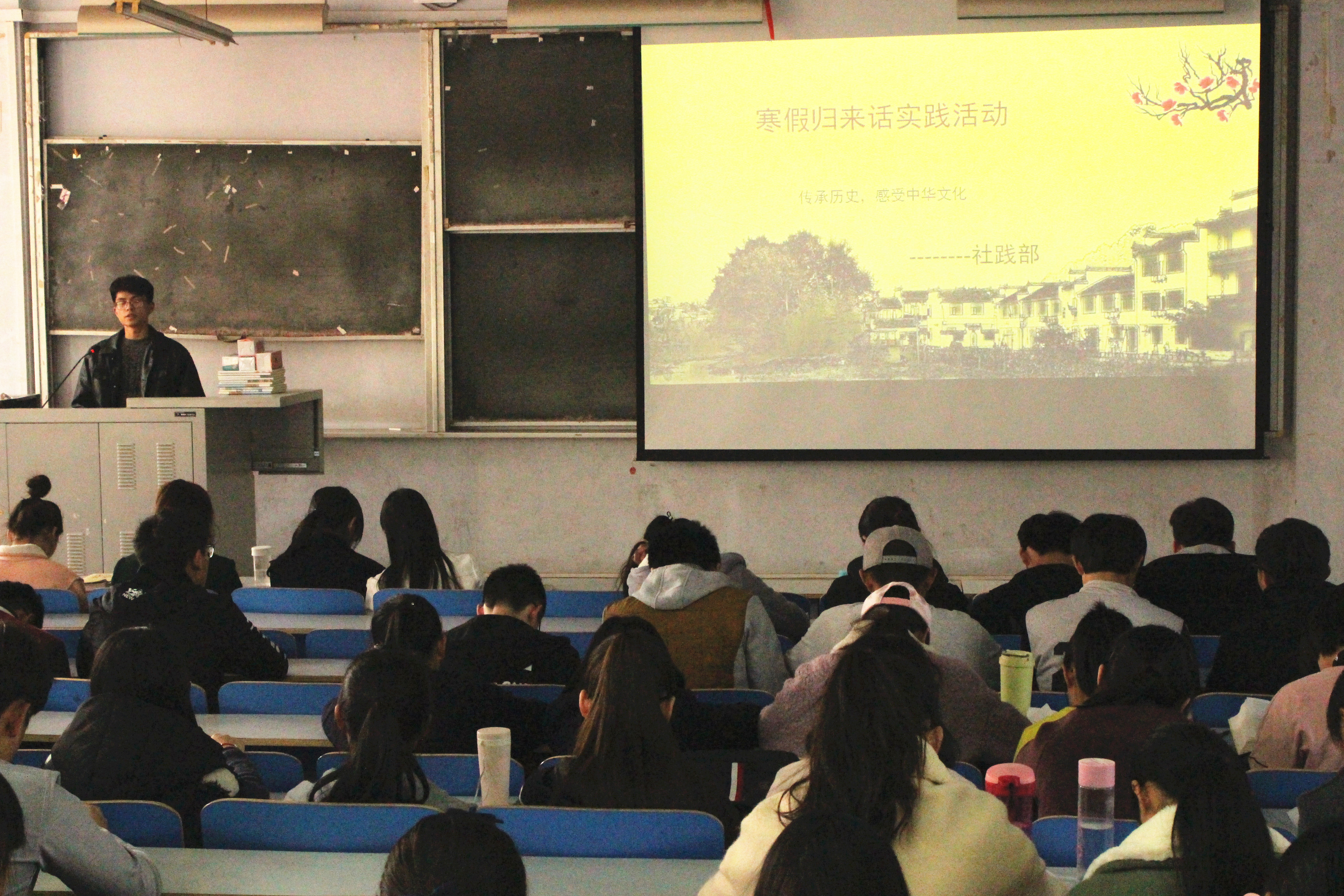 首先,由主办此次活动的社践部部长向大家说明活动的内容和过程,并阐明了本次活动的目的和意义。接下来,几位分别来自开封、汤阴、唐山等地的同学,一一向大家介绍了自己家乡的传统文化和民俗风情。他们利用文字、图片、视频等方式向大家展示了自己家乡独特的风俗习惯、美味特产、民族服饰及地理地貌等。通过他们几个的讲解,同学们对传统文化和各地的民俗风情有了一定的审视和了解,并深深地感受到了华夏五千年优秀传统文化的魅力。最后,又组织大家进行了“挑词连诗”的活动,同学们纷纷积极踊跃的参与。在活动中,频频有同学展现出惊艳的表现,也引得在场观众阵阵热烈的掌声。最后,本次活动在一片欢声笑语中结束。
