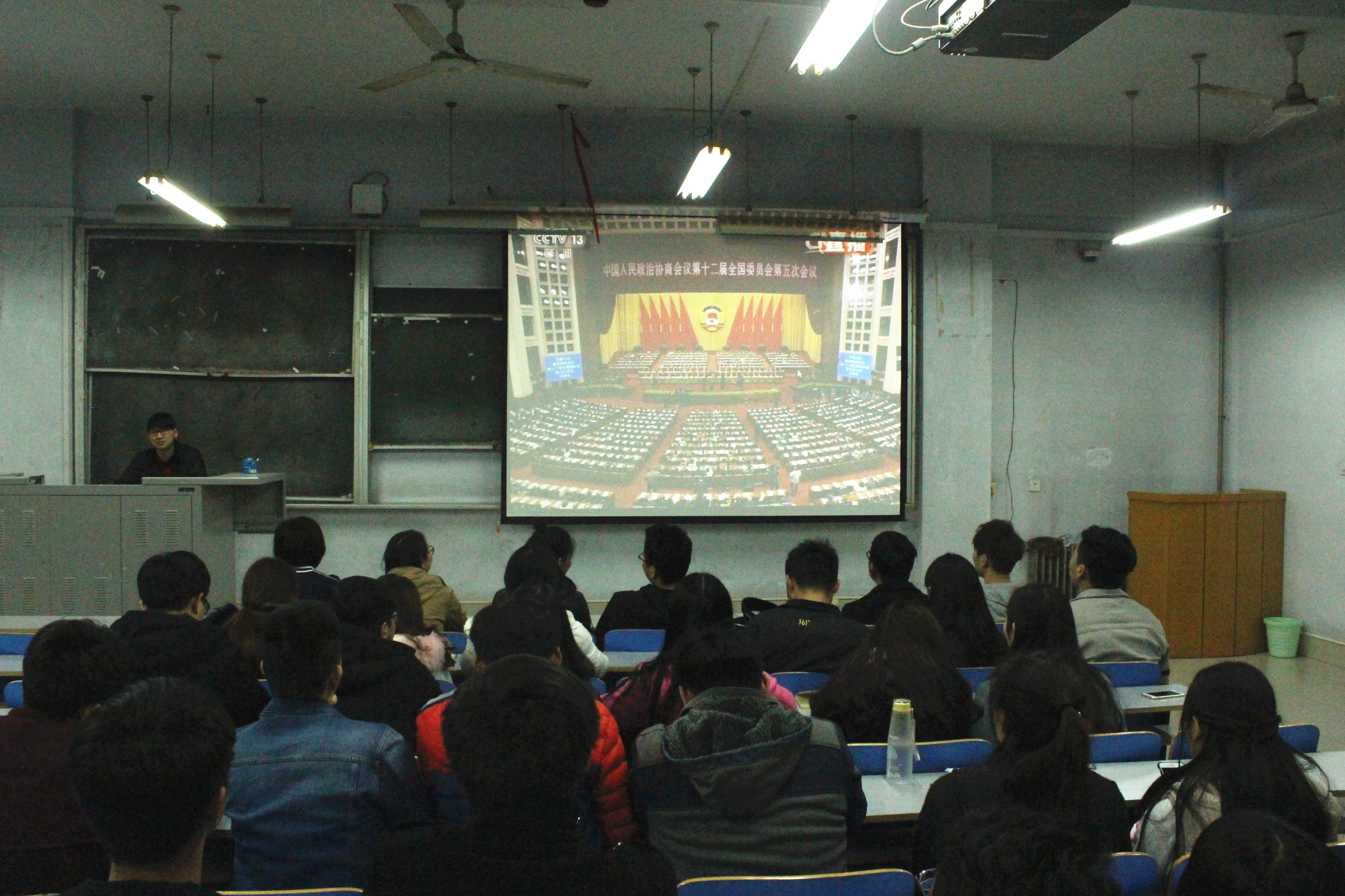 在观看两会视频时,习近平总书记提出的“四个全面”战略——即全面建成小康社会、全面深化改革、全面推进依法治国、全面从严治党让同学们深刻体会到“大国前进”的决心。李克强总理全面的政府工作报告让同学们深刻体会了到国家的繁荣稳定发展。在谈及大学生就业问题时,李克强总理强调要把大众“创业潮”调动起来,并且要加强就业和社会保障,完善就业促进政策。因此大学生应当抓紧机遇,紧跟时代步伐,树立创业观念,并努力学好专业学科知识来服务社会。