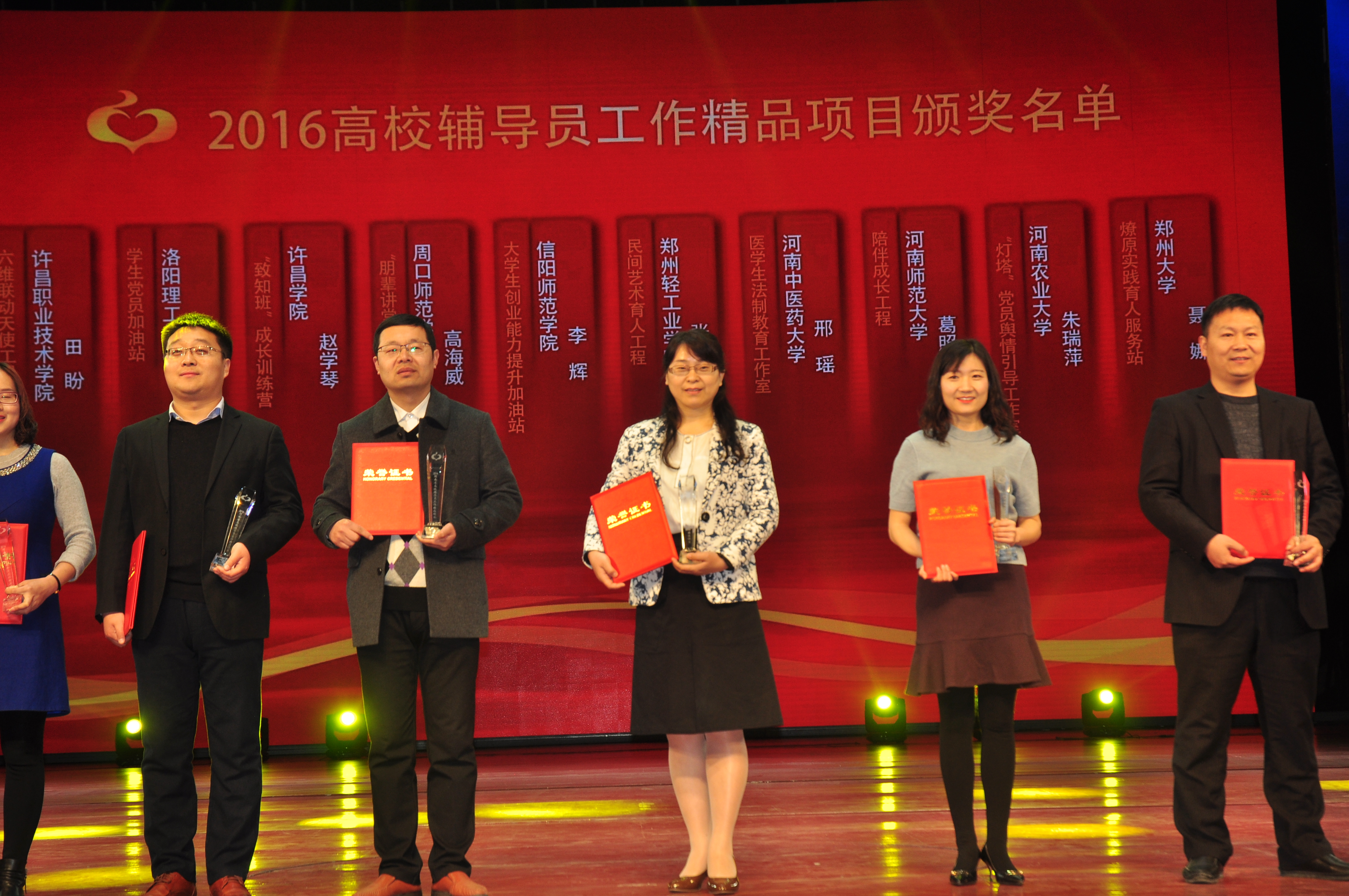 此次会议共颁发4个奖项,包含1个致敬环节。我校艺术设计学院辅导员张莉主持的《民艺美育坊》获奖,并作为获奖代表上台领奖。在向代表河南省参加第一至五届全国高校辅导员职业能力大赛获奖选手致敬环节中,我校辅导员万慧杰、常亮作为代表上台接受表彰,并与全国辅导员工作研究会领导合影留念。在第六届河南省高校辅导员职业能力大赛优秀组织单位和选手颁奖环节中,我校食品与生物工程学院辅导员王楠获颁大赛一等奖,学校获大赛“优秀组织奖”。河南省第三届高校辅导员年度人物颁奖典礼现场播放了我校计算机与通信工程学院辅导员沈高峰的事迹短片,并宣读了组委会授予的颁奖词。省委高校工委专职副书记、省教育厅党组副书记郑邦山为年度人物颁奖并与我校获奖代表亲切交流、合影留念。