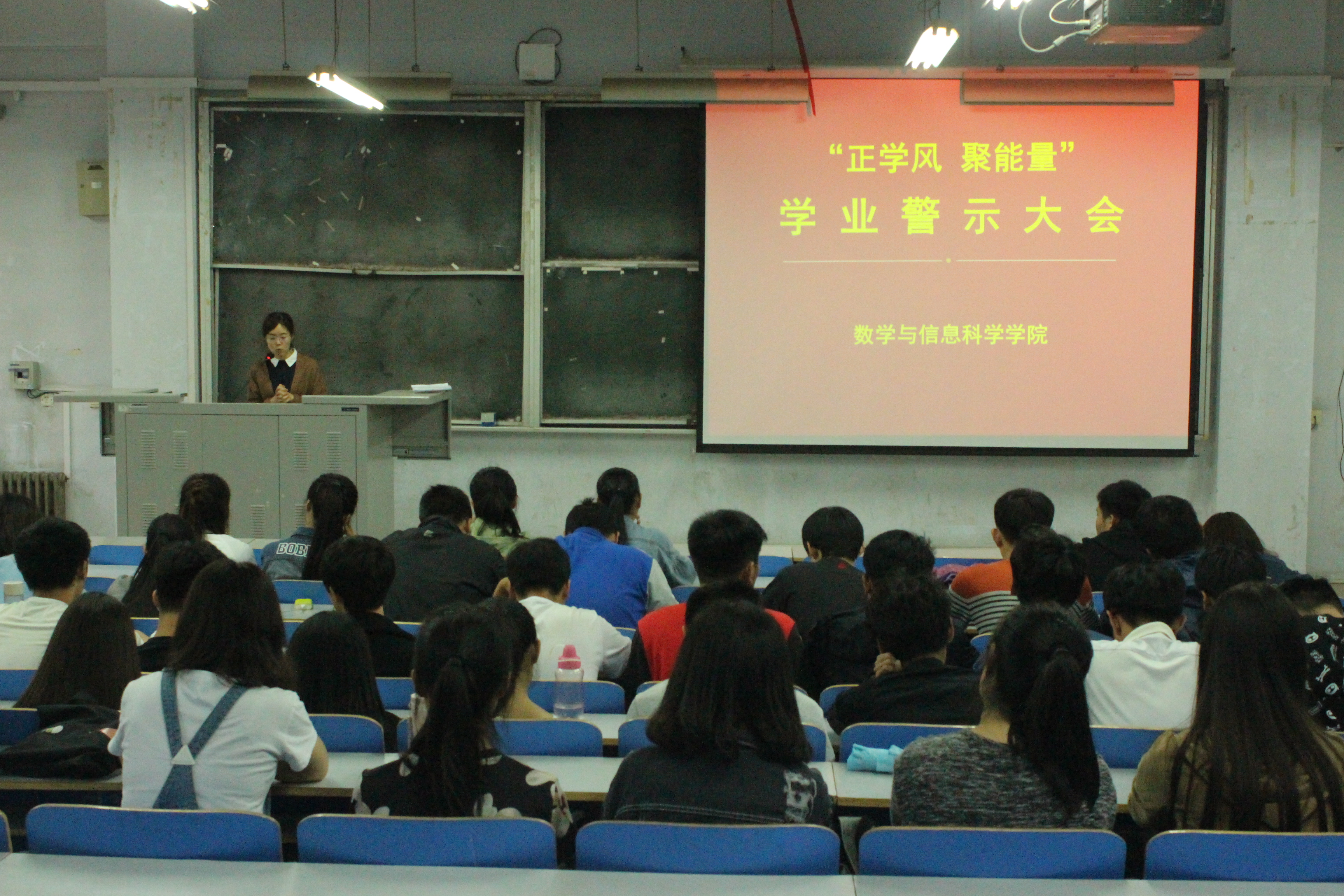 为加强学风建设与管理,让学生进一步明确学习目的,尽快摆脱学业危机,顺利完成学业。5月3日下午,数学与信息科学学院在东一楼218举行了“正学风 聚能量”学业警示大会。