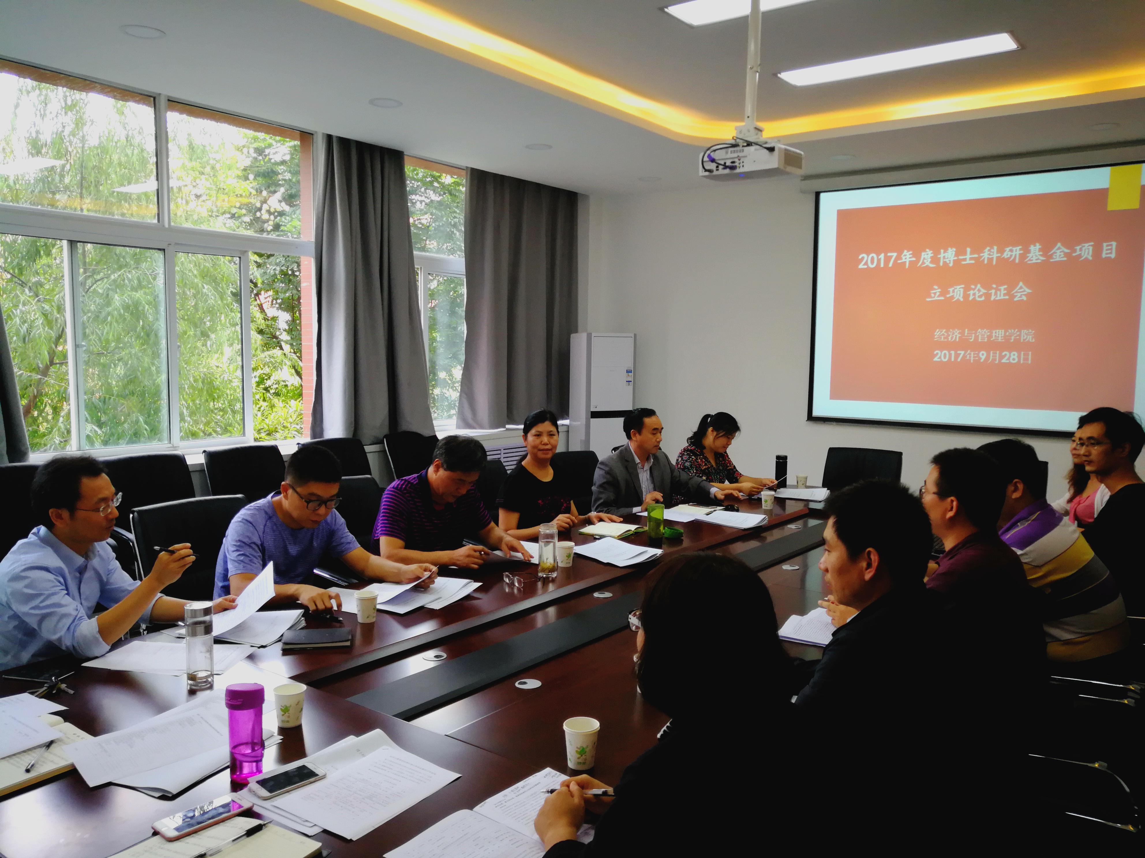9月28日上午9:00,经济与管理学院在科学校区经管楼219召开2017年度博士科研基金项目立项论证会。学院全体学术委员会成员和所有项目申请人参加了会议,会议由符加林副院长主持。