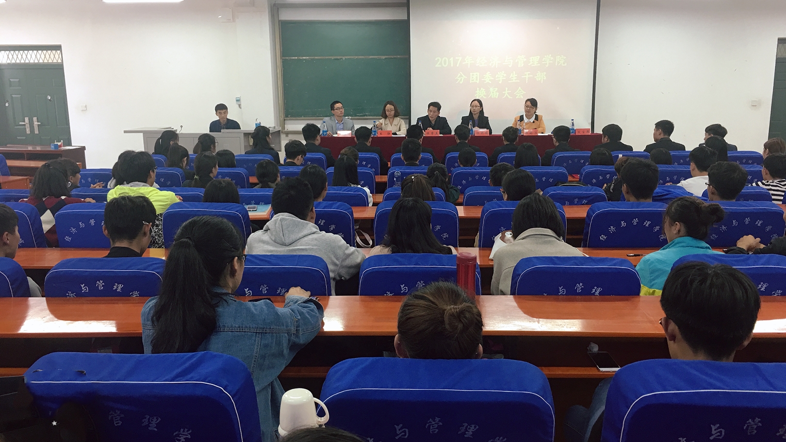 10月20日中午12:30,郑州轻工业学院经济与管理学院学生干部换届大会在经管楼211隆重召开。党总支副书记陈章美老师、学工办副主任王静老师、经管学院分团委陈思萌老师、刘海廷老师、陈莉洁老师出席本次大会,上一届学生会、团总支主要学生干部以及新一届全体成员出席了本次会议。会议由分团委陈思萌老师主持。