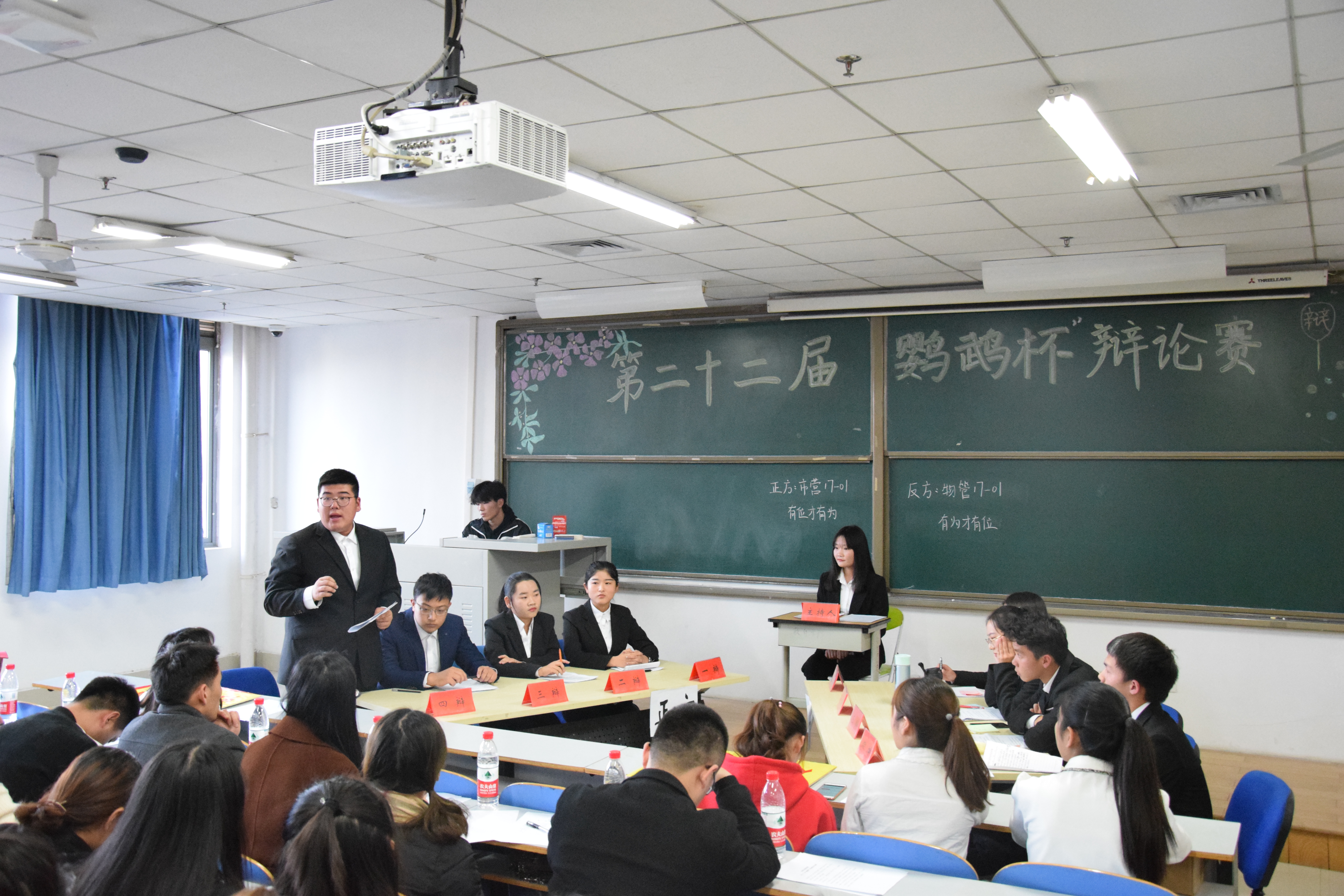 本届辩论赛从筹备到举办决赛历时近两个月,我院共有由17级新生组成的8支代表队参赛,经过四场激烈的初赛和两场精彩的复赛,物管一班和市营一班进入了最后的角逐。总决赛上,正方为市营一班代表队,他们所持的观点是:有位才有为;反方为物管一班代表队,他们所持的观点是:有为才有位。双方选手在立论,驳立论,智辩等各个环节中思路清晰,引经据典,字字珠玑,使现场气氛迅速升温。在随后进行的自由辩论环节中,双方选手就辩题展开更深层次的辩论,个个妙语连珠舌绽莲花的辩论将比赛一次次推向高潮。最终市营一班更胜一筹,取得了本次比赛的冠军。赛后,经济与管理学院党总支副书记陈章美老师为他们颁发了奖状和奖杯。