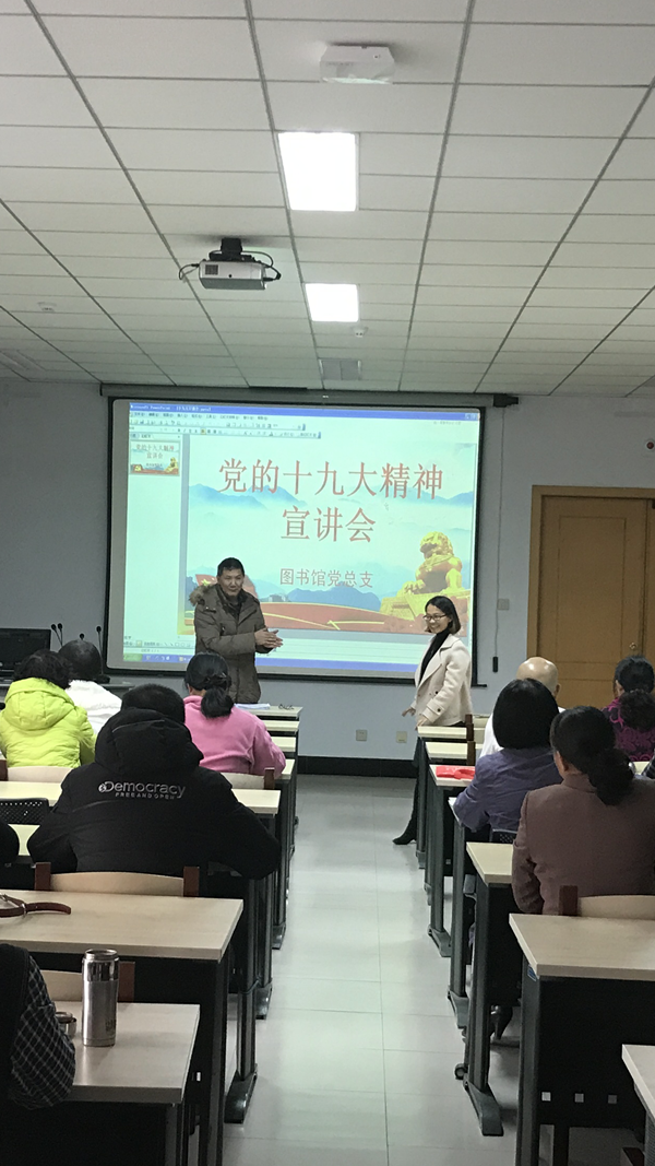 为深入学习宣传贯彻党的十九大精神, 12月7日下午,图书馆党总支在东风校区图书馆六楼报告厅举行学习党的十九大精神专题宣讲报告会。校党委宣讲团成员、马克思主义学院张珍博士作了主题为《多元价值背景下社会主义核心价值观的培育与践行——十九大报告心得体会》的专题宣讲,图书馆、档案馆全体职工参加了报告会。报告会由图书馆馆长袁道强主持。