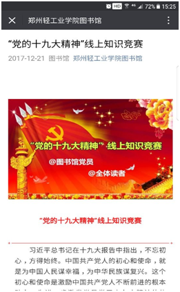 此次以微平台为载体,用知识竞赛的方式来学习宣传党的十九大精神,形式新颖,老师们喜闻乐见,进一步激发了老师、读者们学习党的十九大精神的热情。