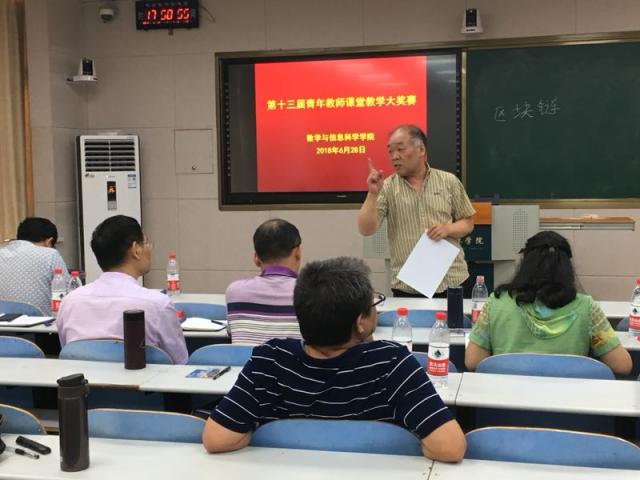 2018年6月28日下午,数学与信息科学学院在教三楼311教室举行了学院第十三届青年教师大奖赛院级竞赛暨学校第十三届青年教师大奖赛选拔赛,在系部预赛推荐基础上,7名青年教师参加了本次竞赛。郑州大学数学与统计学院王书彬教授、学院教指委委员担任评委,学院全体教师参加观摩。