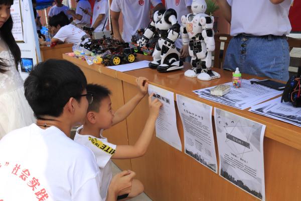 中午12点,小分队队员布置好活动场地后,刚将自己制作的无人机和智能机器人展示出来,就有很多孩子凑上前来观看,并向队员们提问了很多有关无人机与智能机器人的问题,队员们耐心细致地为他们一一解答并对相关原理以及相关知识理论进行普及。炎热的天气并不能阻挡队员们对孩子们的关爱,队员们顶着烈日依旧尽自己最大的努力去讲解。