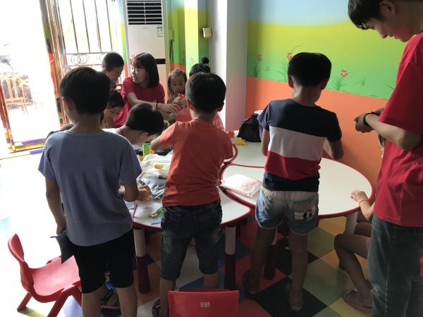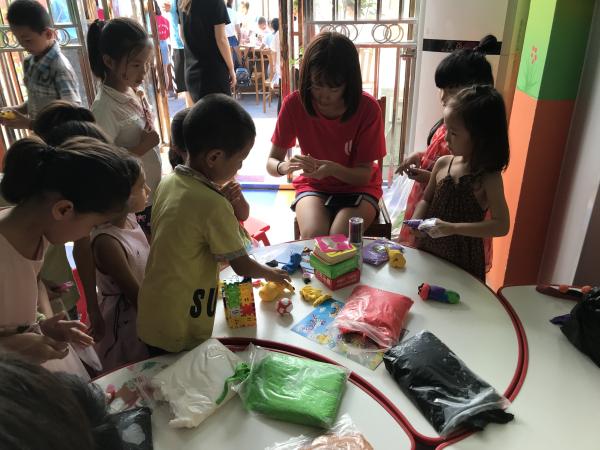 | 小分队成员教孩子们制作粘土模型 |