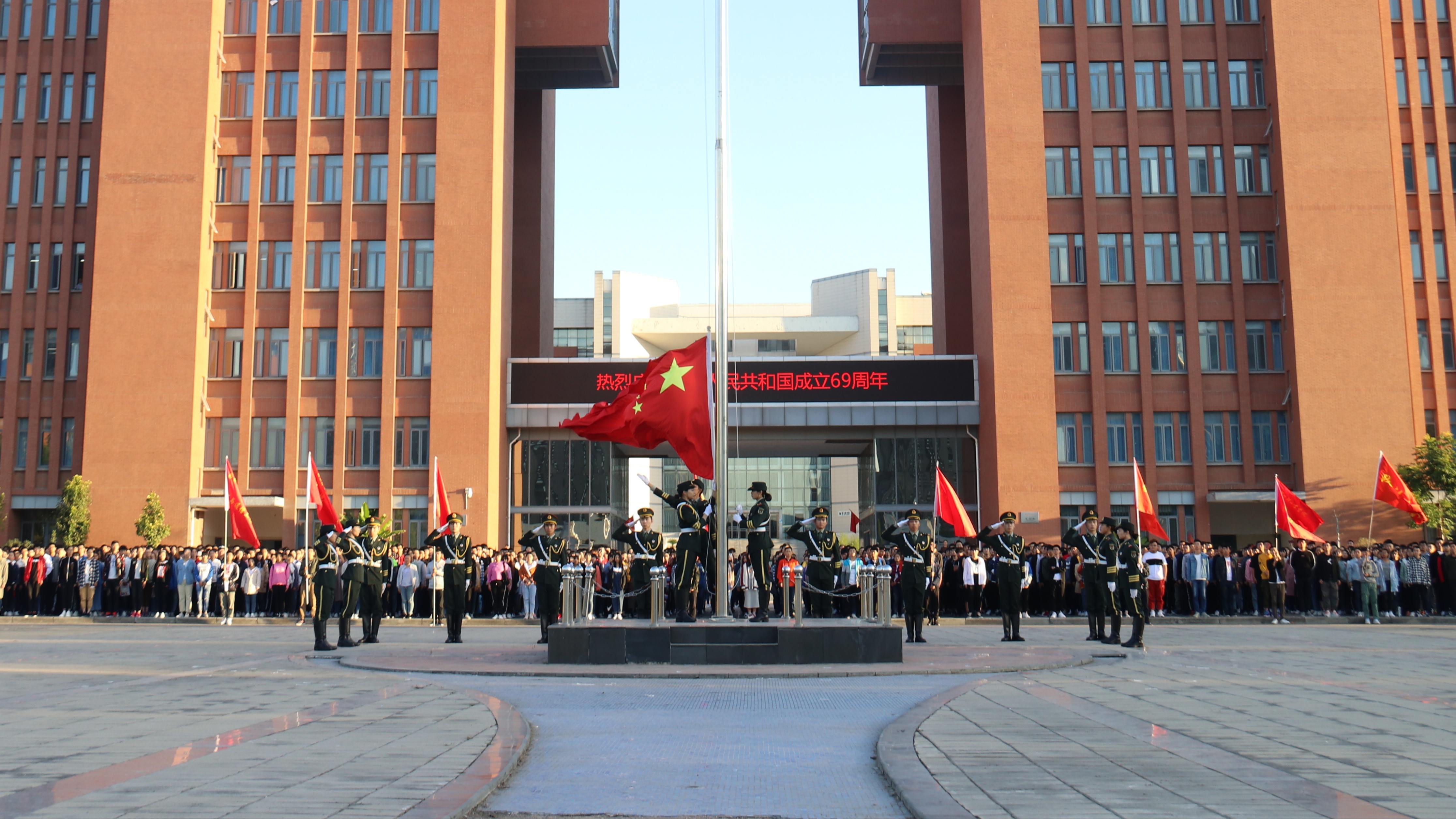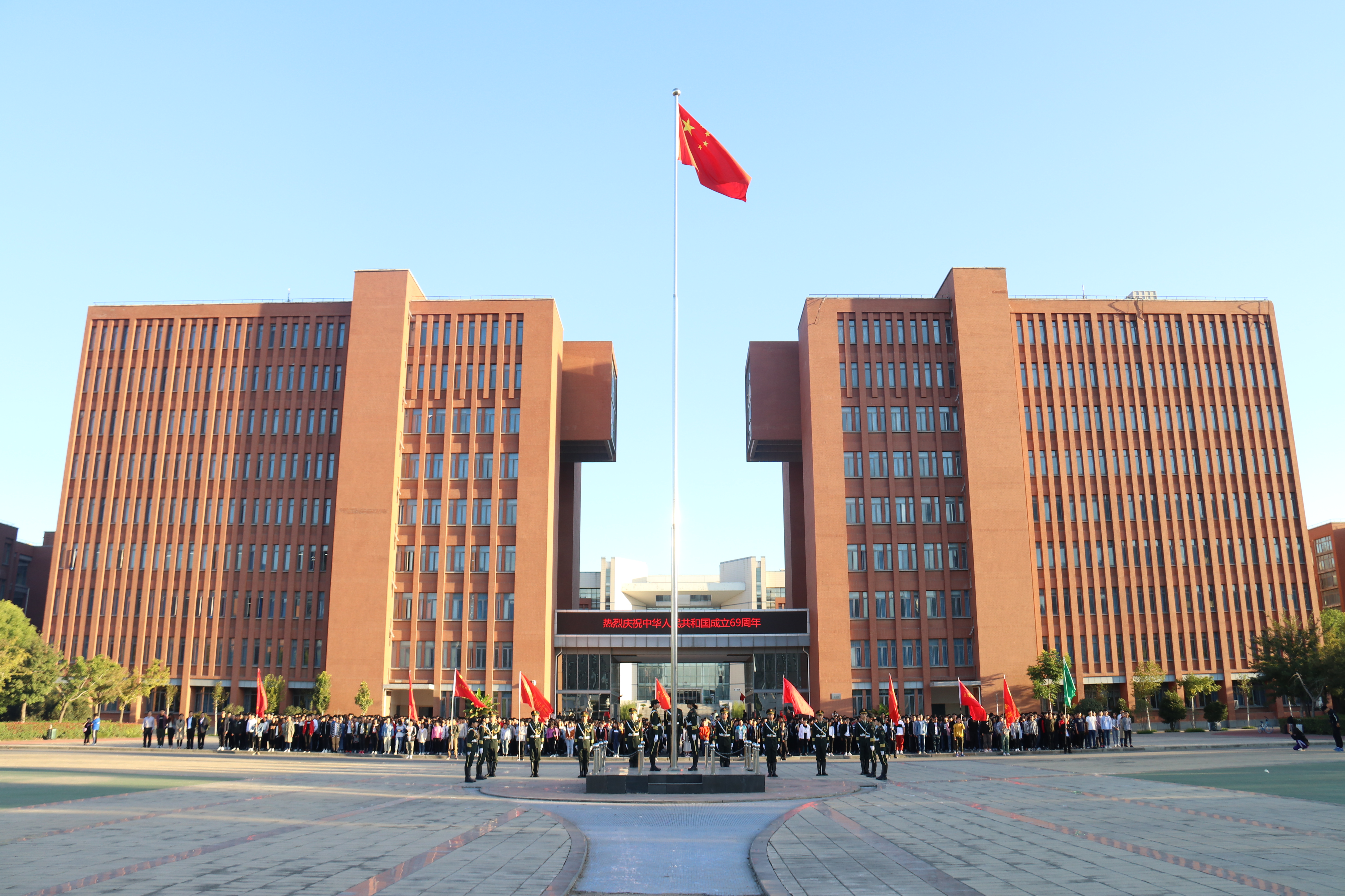 10月1日清晨,我校4000余名师生分别齐聚东风校区图书馆广场和科学校区主教楼广场参加升国旗仪式,共同庆祝中华人民共和国69周年华诞。党委学工部、团委、就业指导中心负责人,各二级学院分团委书记、辅导员和部分党员、学生代表共同见证了这一庄严而喜庆的时刻。