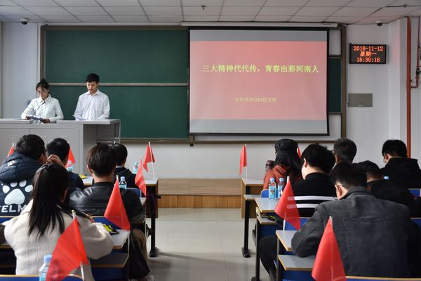伟大的时代需要伟大的精神,伟大的精神成就伟大的事业。“焦裕禄精神”、“愚公移山精神”和“红旗渠精神”是我们河南省宝贵的精神财富,十分值得我们去持续挖掘与发扬。为了将这三大精神持续传承下去,鼓励同学们勤奋学习,让青春不断出彩,2018年11月12日下午,材料与化学工程学院于二教808室举办“三大精神代代传,青春出彩河南人”主题团日活动。应用化学17级全体同学、18级学生代表参加了本次活动。