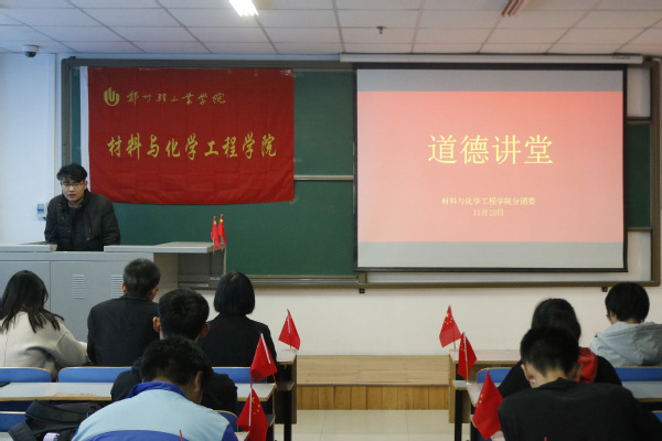 为弘扬中华民族的传统美德、传递正能量、共建和谐校园,11月20日中午,由材料与化学工程学院分团委、学生会举办的以“引领道德新风尚,传递青春正能量”为主题的道德讲堂于科学校区二教楼804室隆重举行。学院部分学生干部及17、18级优秀学生代表参加了本次活动。