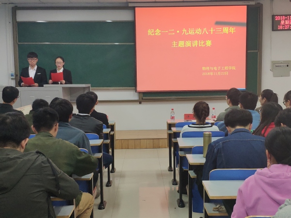 为纪念一二·九运动83周年,深入学习贯彻党的十九大和习近平总书记系列重要讲话精神,展现新时代轻院学子的青春风采,11月22日下午,物理与电子工程学院在二教704教室举办了纪念一二·九运动83周年主题演讲比赛。学院2017级和2018级学生参加了本次活动。