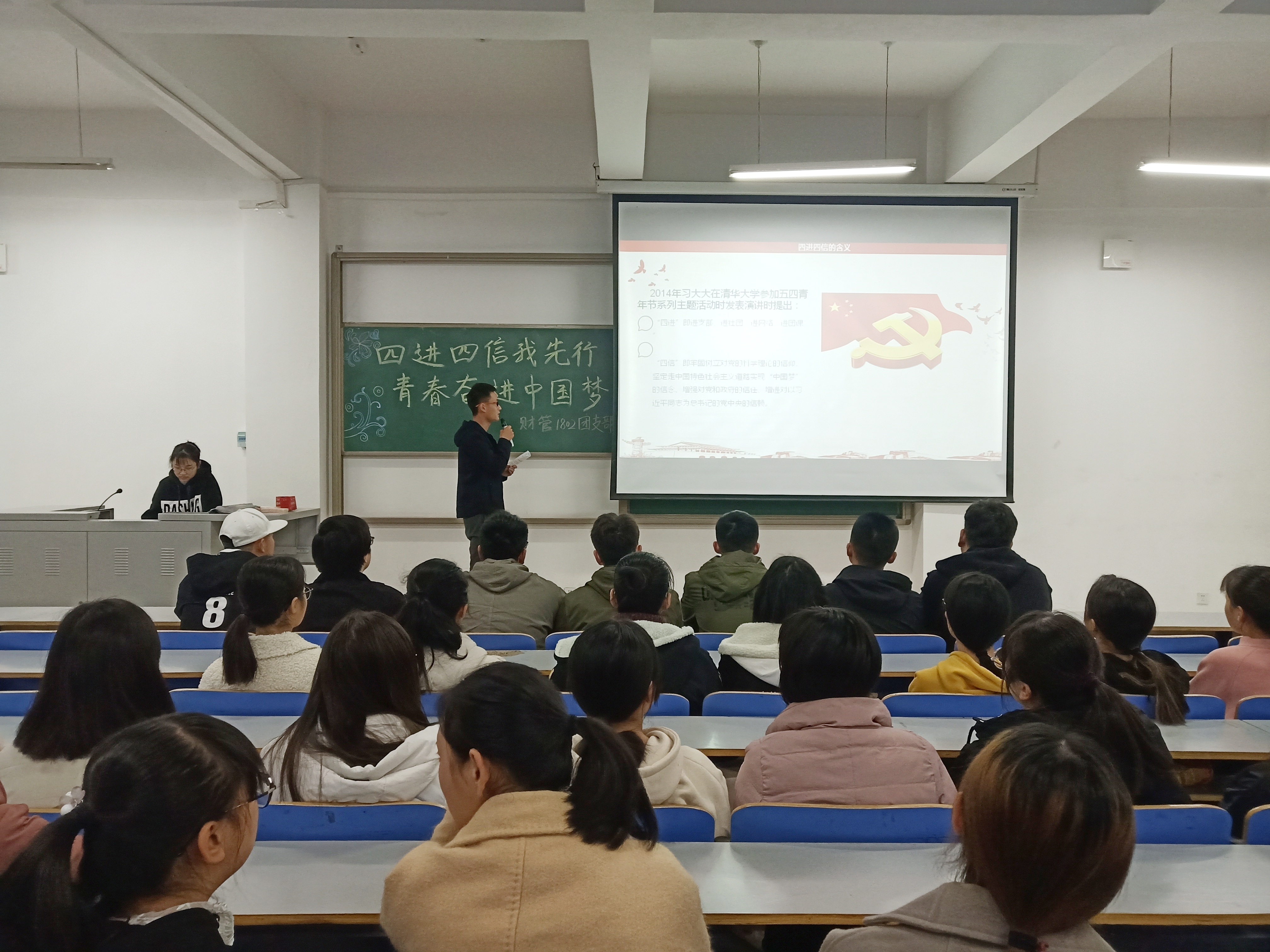 为了深入学习习近平总书记重要讲话精神,进一步增强同学们对学习宣传贯彻讲话精神的重要性、必要性、战略性的认识,用“四进四信”精神引领班级团员青年构建学习型、服务型、创新型基层团组织。经济与管理学院于2018年11月23日8:30在经管楼309举办以“四进四信我先行,青春奋进中国梦”为主题的团日活动。财务管理1802班全体同学参加本次团日活动。