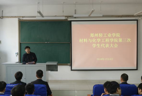 12月4日中午,郑州轻工业学院材料与化学工程学院第三次学生代表大会在化工楼218室隆重召开。学院党总支书记康国磊、校学生会副主席范文杰、分团委书记朱广正、辅导员王光霁、辅导员李瑞瑞及全体学生代表共计120余人参加了大会。