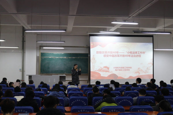 改革开放开拓壮伟航程,青春梦想蕴藏未来华章。为庆祝改革开放40周年,引导广大青年学生认识感受改革开放40年的巨大变化,展示回顾我国改革开放法治发展波澜壮阔40 年辉煌历程。坚定走改革开放道路的信念,坚定不移实施依法治国战略,激励青年学生牢记使命、继往开来、勇担重任、奋发进取。计算机与通信工程学院(电子信息工程学院)“小明法律工作坊”于2018年12月17日晚,在计算机学院楼217室,开展感受我国改革开放法治进程40年学习活动。学院辅导员杜明明及学院主要学生代表200余人参加。