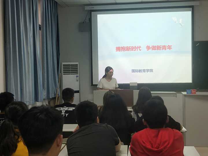 为深入学习贯彻习近平新时代中国特色社会主义思想和党的十九大精神,6月20日下午,国际教育学院在教二楼225开展了“拥抱新时代,争做新青年”主题团课活动。本次团课由国际教育学院分团委书记焦云娜老师主讲,学院主要学生干部参加了本次活动。