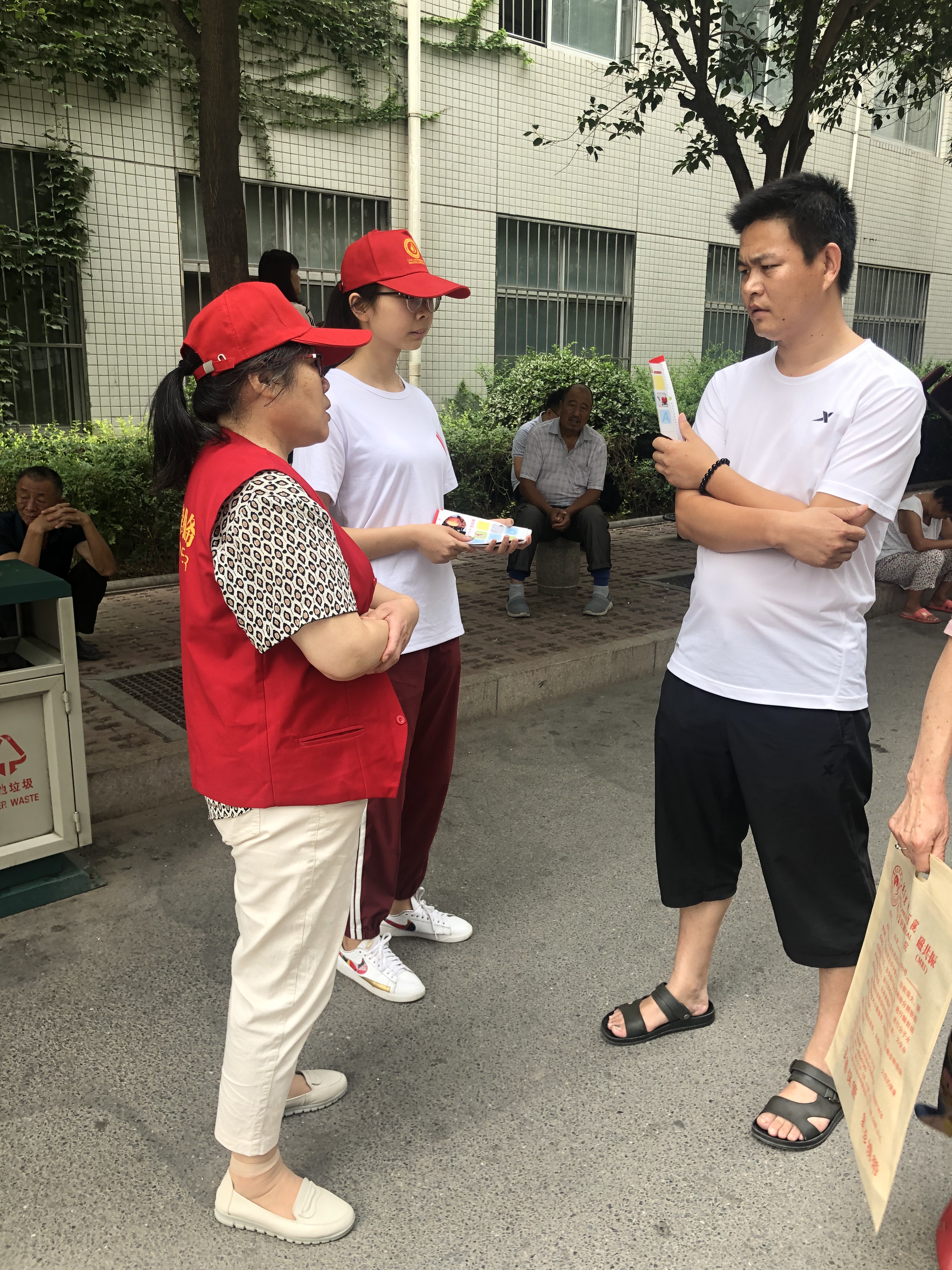 为了更有效地宣传无偿捐献单采成分血,在血站工作人员的带领下,小分队成员进入血站的内部观看了献血的完整过程。通过和工作人员的交谈,小队成员了解到人们对于无偿献血这种利人利已的事缺少参与的热情,可能不仅是因为没有奖励的刺激,还可能是由于不了解无偿献血的深远意义,而对无偿献血有误解甚至质疑。这些让小队成员们意识到宣传无偿献血的重大意义,更加积极地配合血站工作人员宣传无偿献血的相关知识,纵使天气十分炎热,小队成员的热情也丝毫不减,带着无偿献血单采成分血的宣传单到河南省肿瘤医院附近的各个路口发放,并积极地上前给人们讲述无偿献血的流程和意义,耐心为人们解答疑问,以期消除市民对于无偿献血的疑虑并参与其中。