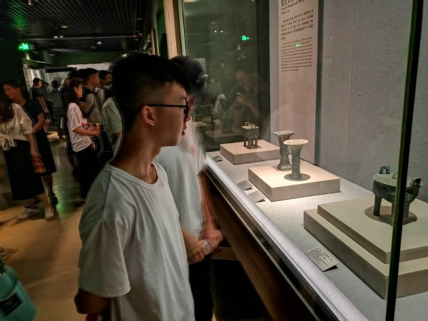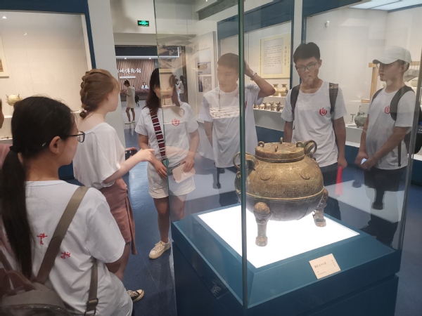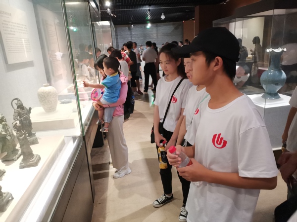 探寻历史足迹,传承先贤文化。为传承先贤文化,队员们来到河南博物院进行参观考察。在讲解员的讲解中,队员们徜徉在历史河流中,了解了各个文物的年代、出土地以及制作工艺等,深受中华文化的洗礼。偶遇一位老艺人,他用特制的水瓶为写下了“郑州轻工业大学”七个端庄雄伟的大字,给人一种大气磅礴的感受,仿佛蕴含着老人的精气神,尽显传统书法的魅力。