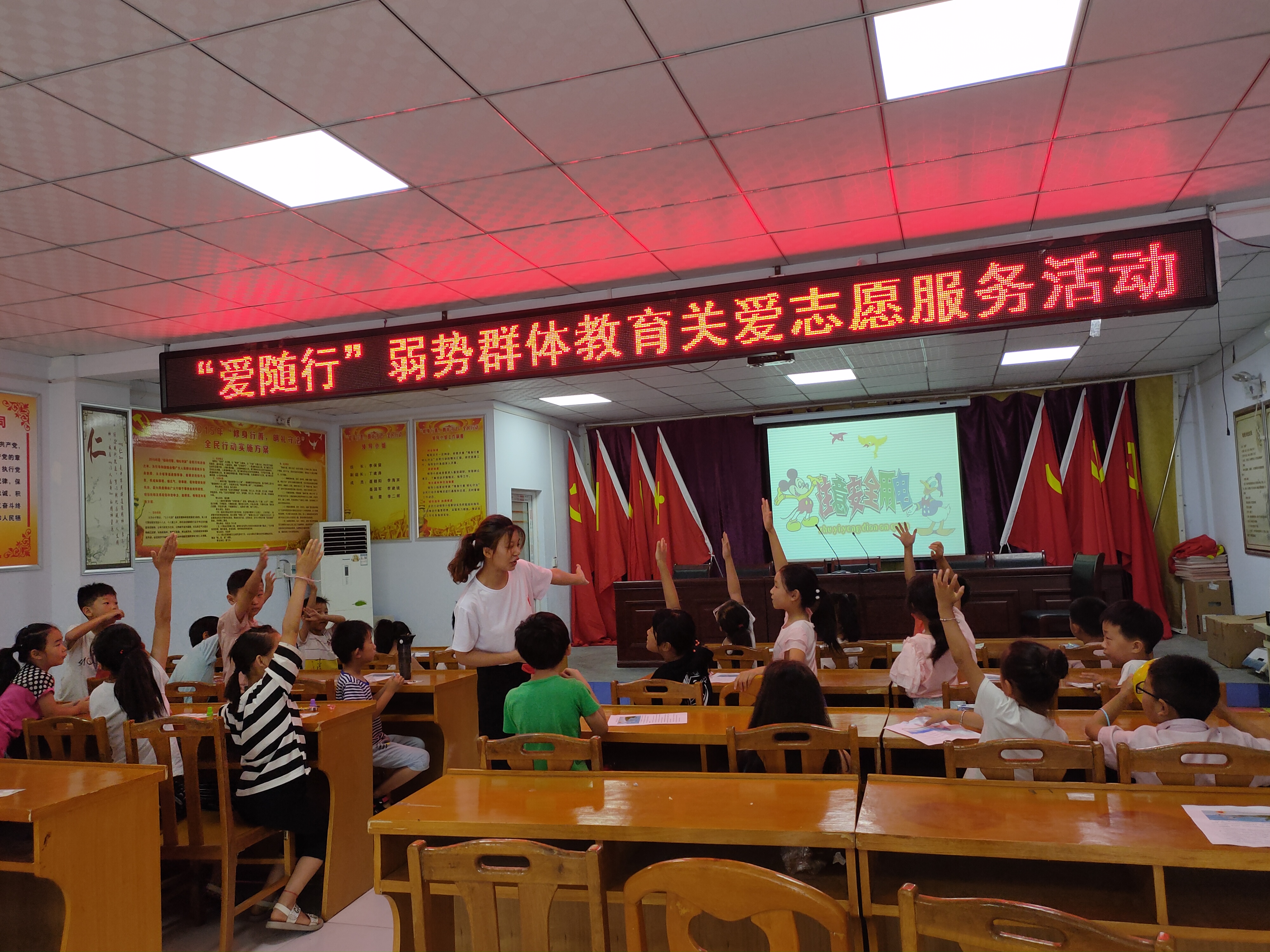 活跃现场气氛,精心组织课堂。为了更好的开展活动,队员们进行了充分的前期准备工作。为了活跃气氛,队员们和孩子们一起做了热身健美操,孩子们也很快和队员们熟悉起来,几个孩子勇敢地上台并不时的喊着“哥哥姐姐,看我看我”。互动结束后队员们给这些可爱的孩子发放了精心准备的礼物。