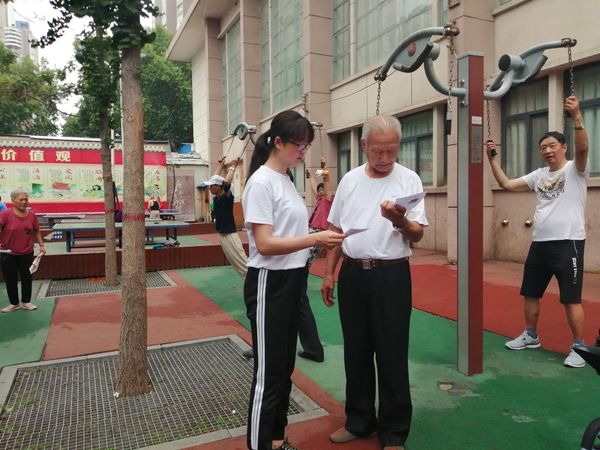 调研健身现状,普及健身知识。活动开展后,团队成员首先对广场锻炼人群进行了走访询问和问卷调查,同时发放全民健身宣传单,队员在走访调研过程中,一位七十多岁的老爷爷向团队成员讲述道,“那公共健身器材可多了,各种花样,能锻炼身体”,“我平时没啥事儿就来练练,锻炼身体还能跟人聊天儿。”