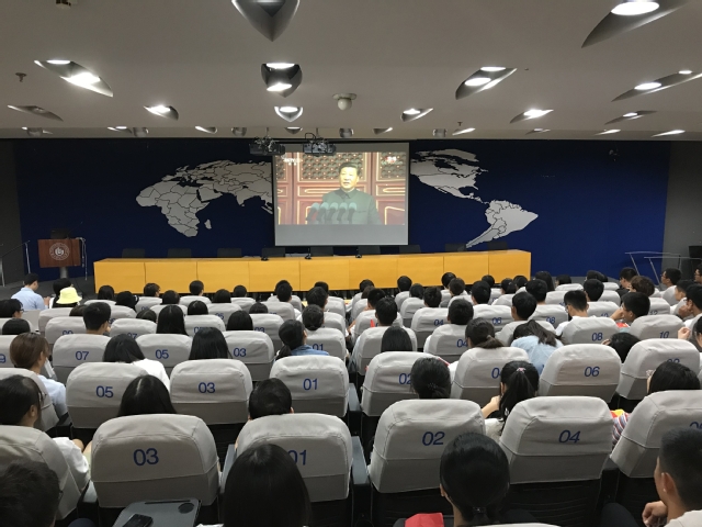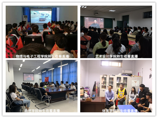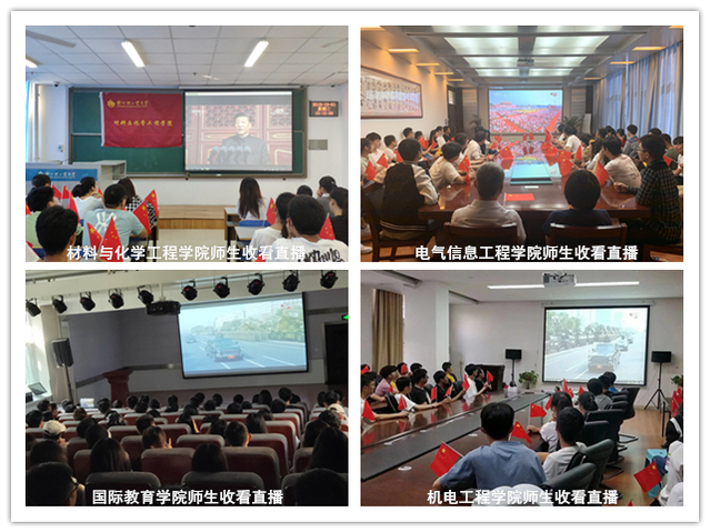 10月1日上午10时,庆祝中华人民共和国成立70周年大会在北京天安门广场隆重举行。中共中央总书记、国家主席、中央军委主席习近平出席大会并发表重要讲话,随后进行了盛大的阅兵式及群众游行。我校在两校区组织近1000名团员青年及教师分别在科学校区活动中心208室、东风校区图书馆学术报告厅、第三会议室集中收看了大会实况,各学院师生通过电视、手机、电脑在会议室、教室、宿舍、校园、实验室等场所收听收看了本次直播盛况。