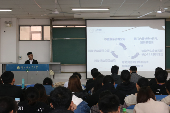 会议开始,学生会各部门代表依次上台进行PPT工作汇报,总结了开学以来开展的各项工作,展示了工作中取得的成绩、制定了部门下个月的工作计划,并从部门内部建设、活动反馈情况等角度分析了工作中存在的不足,提出了相应的改进措施。最后,学生会主席李明睿上台做大会总结,他强调,学生干部要以身作则、谨言慎行、发挥榜样作用,要敢于接受、主动接受大家的监督。要善于思考、勇于创新,发挥好每一名学生干部的主观能动力。