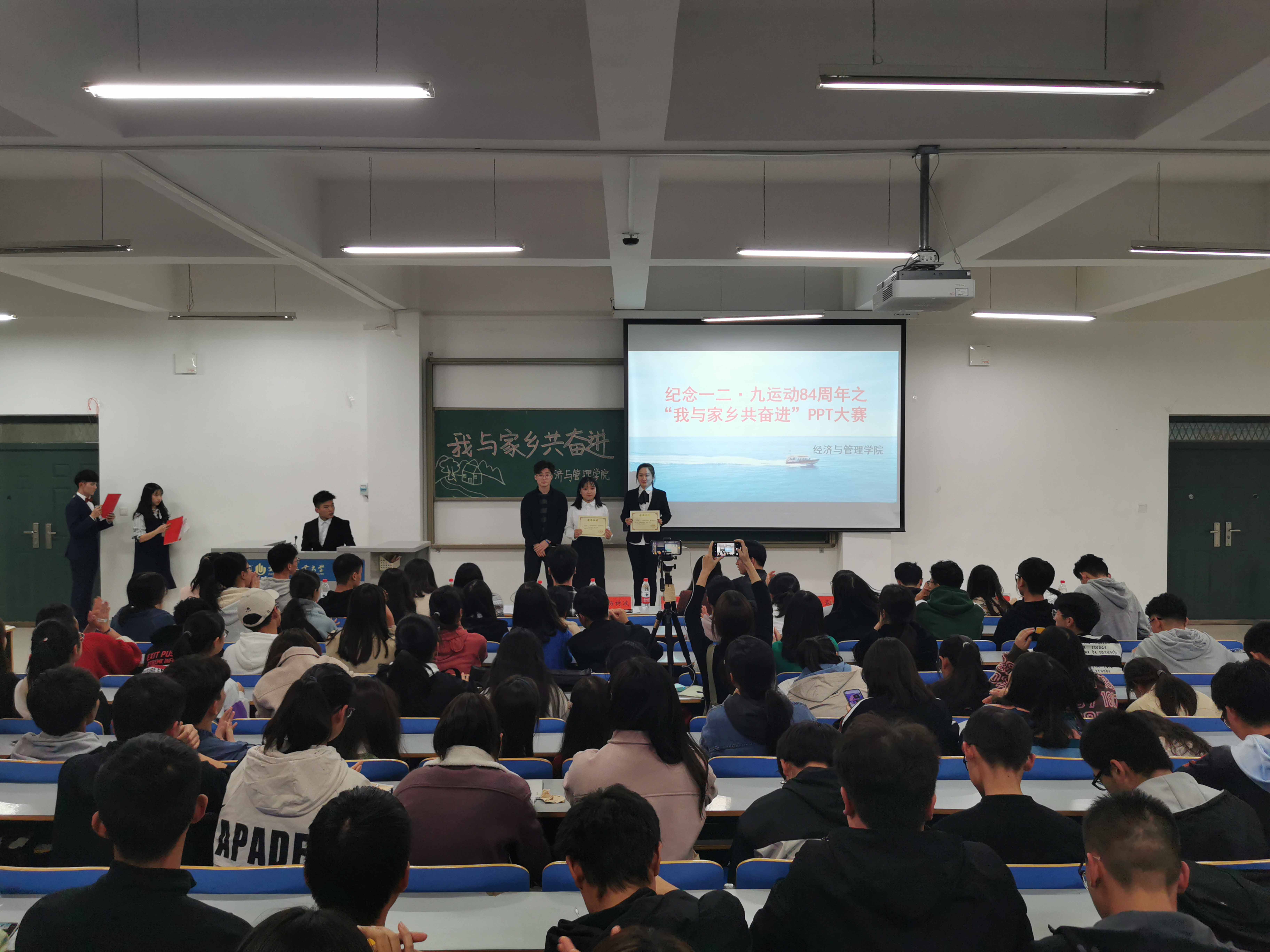 为纪念一二·九爱国运动84周年,进一步继承和发扬家国文化,加强对同学们家国情怀教育,让同学们了解到家乡的沧桑巨变,经济与管理学院于2019年11月21日晚19:00在经管楼309举办了以“我与家乡共奋进”为主题的PPT大赛。经济与管理学院2019级参赛选手、19级各班学生代表参加了本次活动。