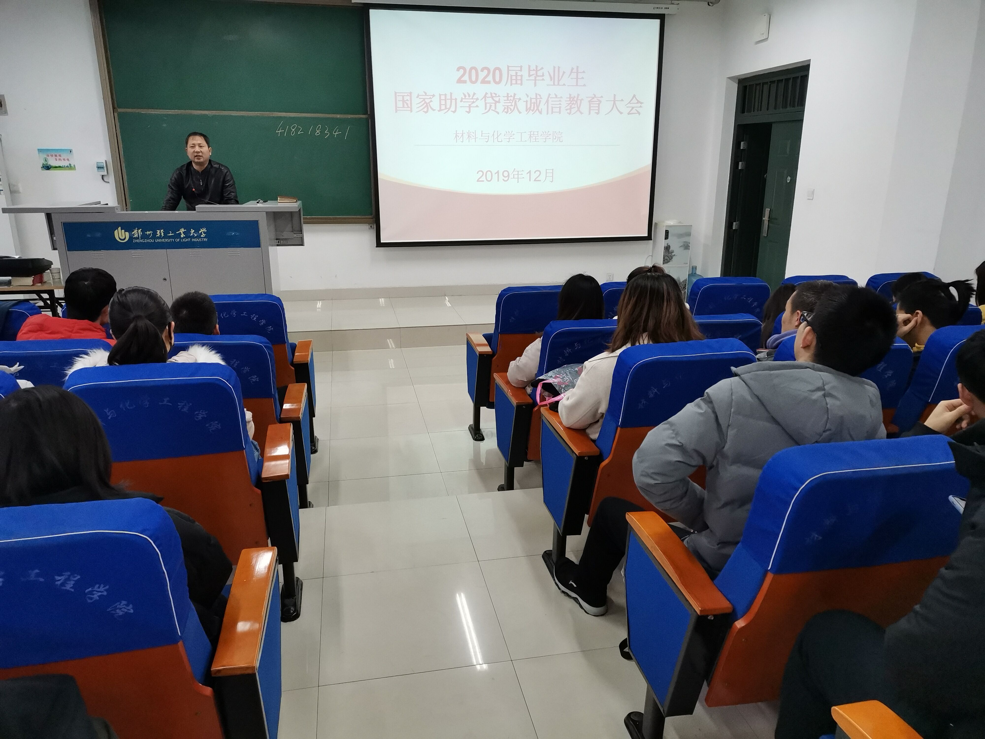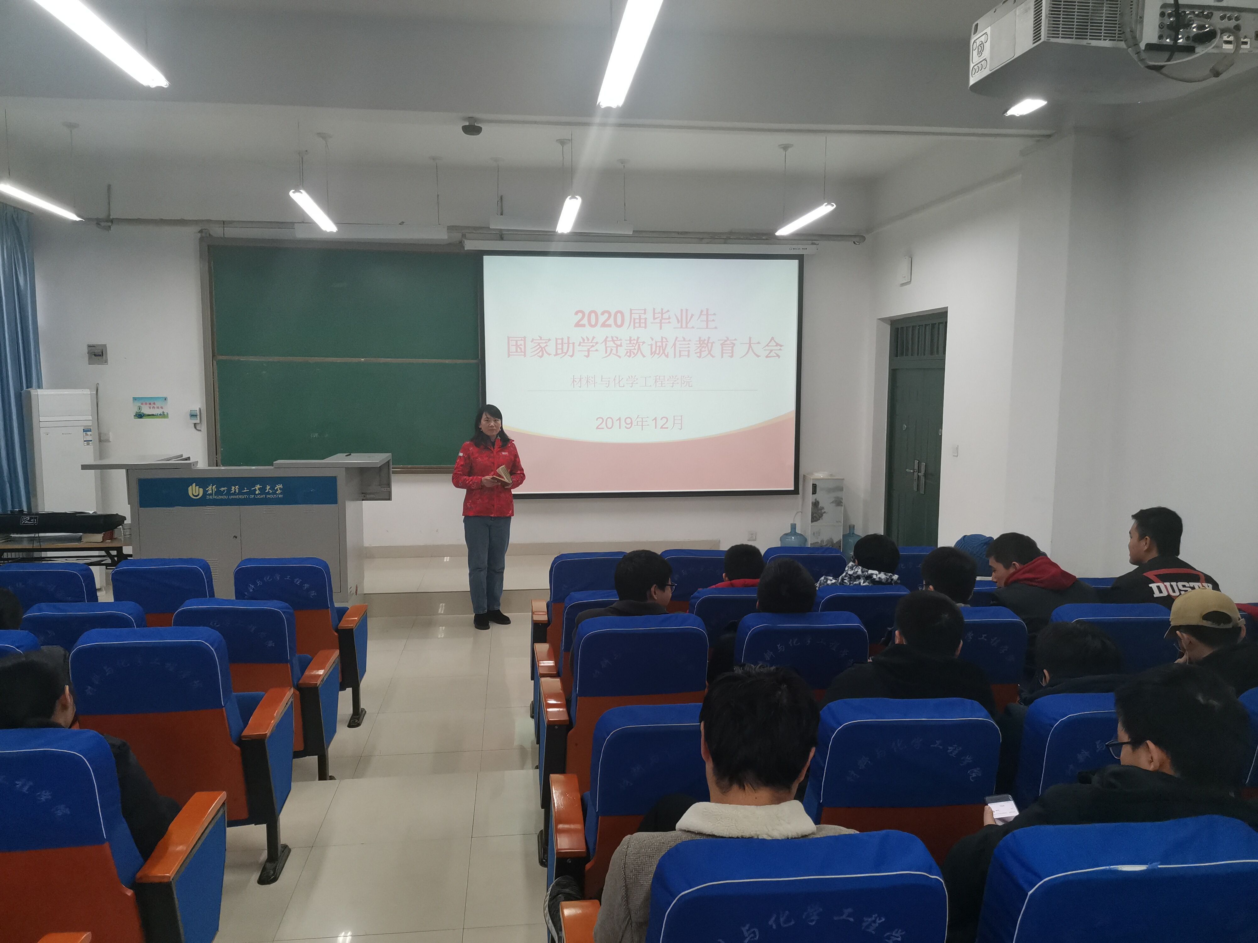 2019年12月23日,材料与化学工程学院在化工楼218教室召开2020届贷款毕业生诚信教育大会,党总支副书记宋德涛老师,负责贷款的郭智荣老师以及2020届贷款毕业生参加了本次大会。