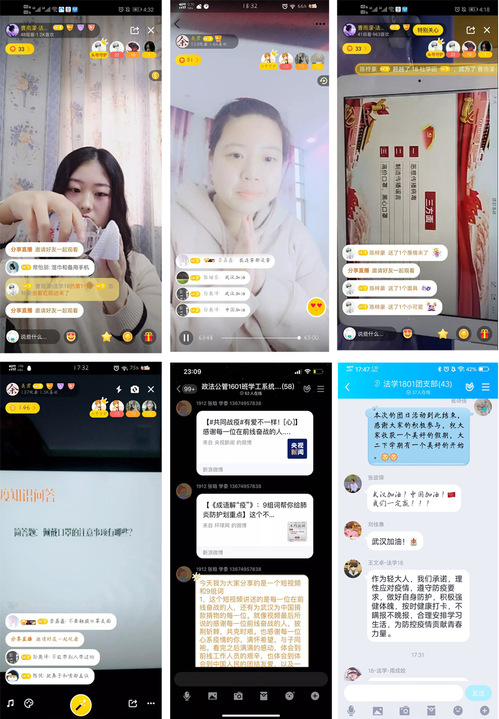 身虽未动,心却凝聚!开学虽延迟,团建不能停!各团支部书记运用网络直播平台,发起线上直播团日活动,组织团支部全体成员进入直播间参与线上互动讨论。公共事业管理19-01班团支书在直播间开展了新型冠状病毒感染肺炎及疫情防控的科普知识问答,大家积极参与答题和讨论;介绍了学校关于疫情防控的相关安排,传达了《郑州轻工业大学关于推迟2020年春季学期开学时间的通知》、《致郑州轻工业大学各级团组织和广大团员青年的一封公开信》等通知精神,并呼吁同学们尽量少出门,外出戴口罩,做好防护,按时报送情况,减少疫情传播。法学18-02班团支书在网络直播平台结合专业知识,和大家共同探讨了疫情防控中的相关法律问题,号召大家拉起法律警戒线,不信谣、不传谣,带动身边的人知法、守法,传播科学知识,有序开展疫情防控斗争;向大家讲解了不同场合应如何采取有针对性的防控措施,同学们就特殊时期如何合理安排学习生活、开展网上课程学习各抒己见,展开了热烈的讨论。各班级团支部通过QQ群、微信群等线上平台,广泛开展线上团日活动,进行传染病疫情防控专项学习,传播科学知识,帮助同学们提升防控意识,增长防疫知识;分享在疫情防控中的心理防护措施,引导大家保持良好心态。