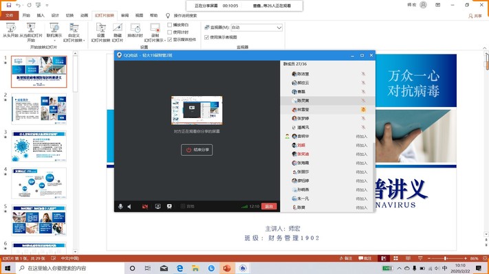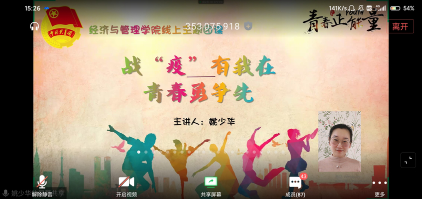 2月21日晚,经济与管理学院分团委书记姚少华利用腾讯会议平台直播了一堂题为“战‘疫’有我在,青春勇争先”的主题团课。经济与管理学院2018级团员青年参与了这堂特殊的团课。一场“新型冠状病毒肺炎”改变了我们原有的相聚方式和过年模式,面对这场抗击疫情阻击战,本次团课从“紧跟党走,坚决打赢疫情防控阻击战”“并肩战“疫”,团员青年勇争先”“战“疫”有我在,励志勤学担使命”三方面讲述了疫情防控中白衣逆行者、广大青年干部的感人事迹,正确引导广大团员们要以疫为鉴,坚定信心,与祖国“同呼吸、共命运”,肩负起青年的使命、义务、责任和担当,励志勤学,在磨难中成长,经管学子们也用青年人自己的方式为战“疫”的胜利加油助力!