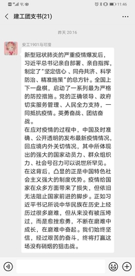 近日,我校组织全校团员青年通过电脑、手机等工具在线收看了团省委推出的《全民战疫与中国特色社会主义制度自信》主题团课,并通过微信群、QQ群等工具展开讨论、分享学习心得体会。