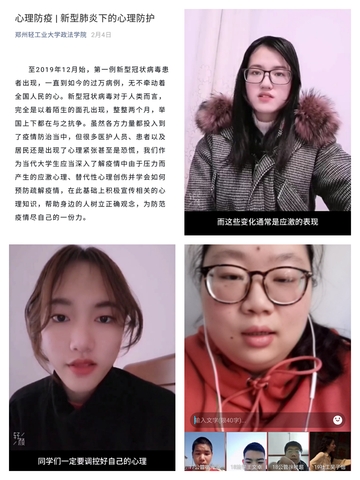 新冠肺炎疫情发生以来,学院多举措扎实推进抗疫防疫心理健康教育工作,宣讲普及疫情防控知识,开展班级心理辅导活动,正面引导学生舒缓心理压力,牢牢构筑战疫“心”防线。一是立足实际,开展学生心理状态摸排工作。1月中旬,学院就积极开展摸排工作,及时了解学生因疫情产生的心理变化及原因,帮助其梳理情绪,正确看待相关问题,精准把控学生状态。对于湖北籍的同学,做到积极关注,专人联络,及时行动,确保学生身心健康。二是加强心理防护知识宣传,督促学生开展心理学习。撰写了“心理防疫,新冠肺炎下的心理防护”主题推文,制作配套微视频,积极发挥心理委员的作用,开展朋辈心理辅导工作。三是持续推进专项工作,打好心理防疫攻坚战。2月25日,组织学生填写疫情心理健康状况自评量表,及时了解学生在网络学习适应过程中产生的问题,通过多种途径密切关注学生心理状态。3月1日,召开学院心理健康工作视频会议,心理专职辅导员栗想老师对前一阶段心理工作进行总结,制定了下一阶段心理健康教育工作计划。