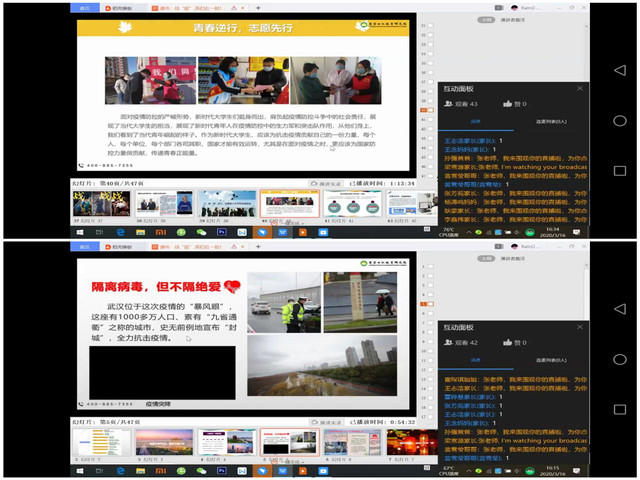 各年级辅导员运用新媒体线上微直播、微宣讲等形式,面向学院全体学生开展理论宣讲。辅导员老师分别以《信心、责任、使命》、《坚定战疫信心,坚守责任使命》、《战“疫”,我们在一起》、《不忘初心跟党走,我与祖国共奋进》为题,从全民战疫中凸显中国特色社会主义制度优势、中国抗疫彰显负责任大国担当、中国共产党人各个时期的历史使命、青年一代在担当责任中历练成长等方面展开讲解。课堂上,老师们宣传了党和政府关于疫情防控的一系列重大决策部署和各地区各部门贯彻落实的有力行动,介绍了我国防控疫情取得的显著成效以及国际社会对中国高效抗疫的评价,呼吁新时代青年要珍惜这个时代,努力拼搏、不负韶华,不辱时代使命,不负人民期望。