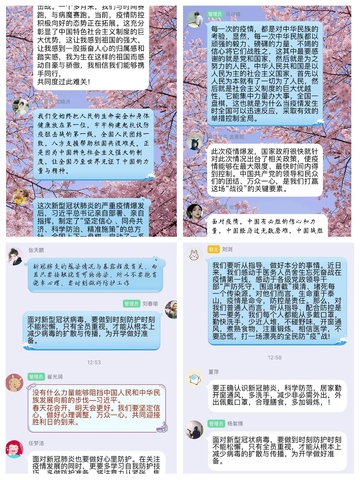 本次学习活动由辅导员或班主任主持,以线上班会的形式开展,加强对疫情防控知识的学习。在线上环节中,同学们认真学习了翟德胜教授关于“什么是新型冠状病毒肺炎”、“居家期间个人防护”、“返校途中个人防护”和“返校后疫情防控”这四个问题的相关内容,帮助同学进一步培养防护意识,为后续学习生活做好准备。同学们都认真观看了《心理干预宣传片-春天花会开》,并就近期的心理变化和心理情绪展开了积极讨论,同戴心理“口罩”,共筑心理防线。同学们还就疫情期间的感悟与收获进行了分享,纷纷表示要向战“疫”一线的优秀榜样学习,努力将个人的成长发展与祖国、人民的需要紧密相连,不惧风雨、勇挑重担,让青春在党和人民最需要的地方绽放绚丽之花。