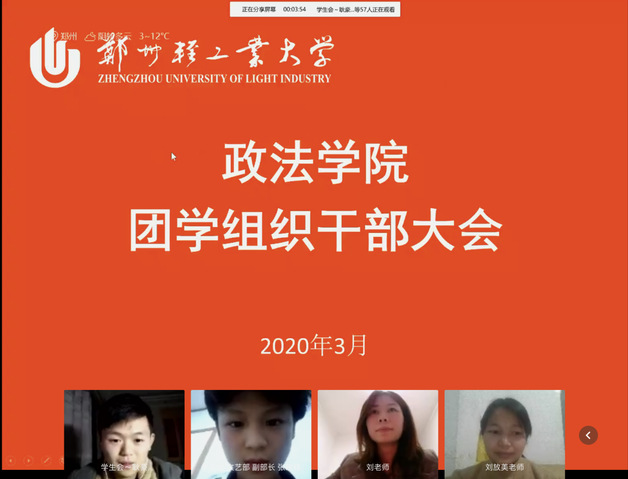 为进一步发挥团学干部在疫情防控工作中的示范引领作用,提升团学干部的大局意识、担当意识、责任意识,政法学院于3月29日晚8:00在线上召开全体团学干部会议,政法学院党委副书记刘放美老师和全体团学干部参加了此次会议,会议由分团委书记刘栩静老师主持。