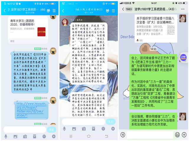 为贯彻落实共青团河南省十四届八次全委(扩大)会议精神,推进共青团工作顺利开展,政法学院于3月27日——3月31日期间以团支部为单位,开展线上学习活动。