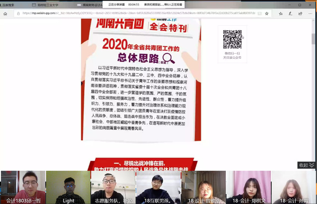 为深入学习贯彻共青团河南省十四届八次全委(扩大)会议精神,3月30日,国际教育学院以团日活动的形式,组织学院学生开展了线上学习活动。