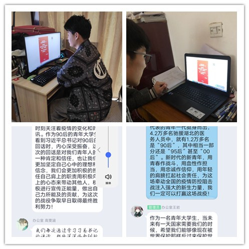 习近平总书记在给北京大学援鄂医疗队全体“90后”党员的回信中指出:“在抗击新冠肺炎疫情的斗争中,广大青年用行动证明,新时代的中国青年是好样的,是堪当大任”。习近平总书记的回信深深鼓舞了学院广大青年学生,同学们纷纷表示要深刻把握总书记重要回信精神的核心要义和精神内涵,把总书记的谆谆教导和殷切嘱托内化于心,外化于行,以实际行动向驰援湖北的1.2万多名“90后”医护人员学习,自觉肩负起时代赋予的神圣使命,积极投身新时代中国特色社会主义建设的伟大实践,让青春在为民服务,为国奉献的实际行动中绽放光彩。