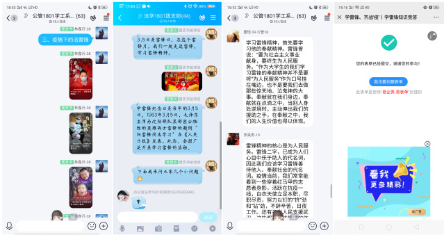 各团支部运用QQ、微信等线上平台,通过重温雷锋故事、观看雷锋纪录片、参与学雷锋知识竞赛等形式,集中学习了雷锋生平的感人事迹,深刻领悟了雷锋精神全心全意为人民服务的实质和精髓。同时,同学们积极分享了面对突如其来的疫情,身边涌现出的感人战“疫”事迹,他们用实际行动传承和发扬了雷锋精神、讲述了新时代雷锋故事,诠释了默默奉献、无畏风险的新时代雷锋精神。同学们纷纷表示,将以战“疫”英雄为榜样,争做新时代雷锋传人。