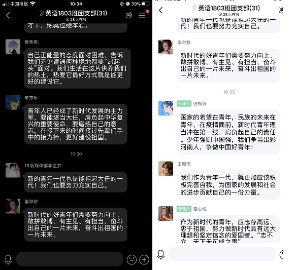 各基层团支部通过线上视频、电话会议等形式传达了共青团河南省十四届八次全委(扩大)会议精神,重点学习了《2020年全省共青团工作要点》和王艺书记题为《把准工作主线 提升“三力一度” 为谱写新时代中原更加出彩绚丽篇章贡献青春力量》的报告。报告总结了过往的成绩、提出了当前的重点、明晰了下步的思路。广大团员通过线上座谈专题学习会议、交流体会等形式认真讨论,学思践悟,大家一致认为,在今后的学习工作中,要提高政治站位,加强理论学习;把灾难当教材,与祖国共成长,提升对学校中心工作和区域经济的贡献度;要提升基层团支部活力,以对标争先为理念,打造团组织堡垒的基石。