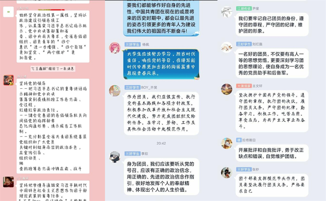 共青团河南省十四届八次全委(扩大)会议全面回顾了2019年全省共青团事业的各项成就,明确了2020年工作的总体思路和要点,为当前及今后一个时期的共青团工作提供了根本遵循。各班级团支部通过线上团日活动传达了会议精神,重点组织学习了王艺书记《把准工作主线 提升“三力一度”为谱写新时代中原更加出彩绚丽篇章贡献青春力量》的讲话,并围绕学习内容展开热烈讨论。同学们纷纷表示,要深刻领会会议精神实质,并把会议精神融入到日常学习生活中去,迎难而上、奋发进取,牢记使命担当,贡献青春力量。