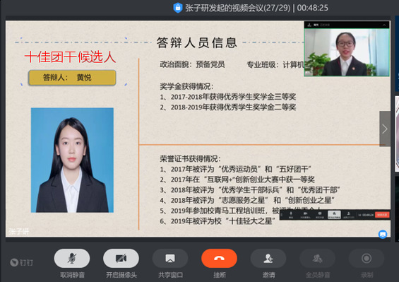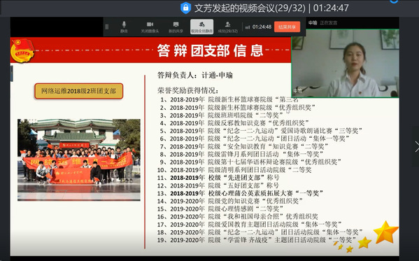自3月中旬2019年度我校共青团系统先进集体和个人评选工作开展以来,线下经个人和集体申报、团支部评议、学院初审公示等环节,各基层团组织已完成优秀团支部、优秀团干、优秀团员、优秀团日活动的初步评选工作,校团委正在进行最终审核。经各基层团支部、团干、团员申报,基层团组织评选,二级分团委初审公示,校团委审核把关后,全校共有17个十佳红旗团支部候选单位、17名十佳团干部候选人、17名十佳团员候选人进行进入十佳集体和个人线上演讲答辩展示环节。为确保本次线上展示答辩工作顺利进行,校团委前期制定了工作预案,认真组织答辩评委,按计划预约网络会议室并对答辩软硬件设备作了精心调试。答辩前一天进行彩排,当天,候选人和集体按计划分别进入各自网络会议室演讲答辩,整个答辩过程井然有序。